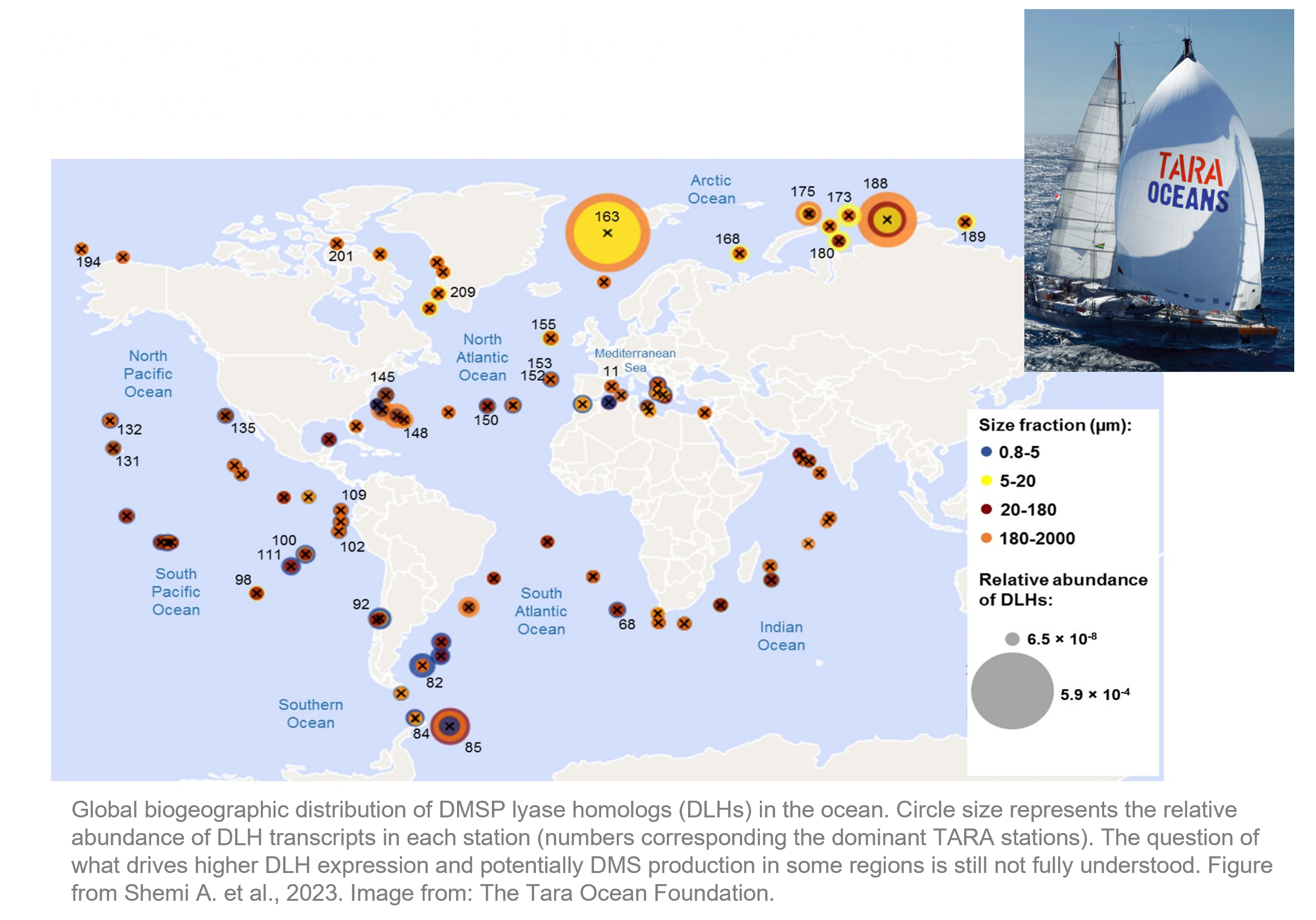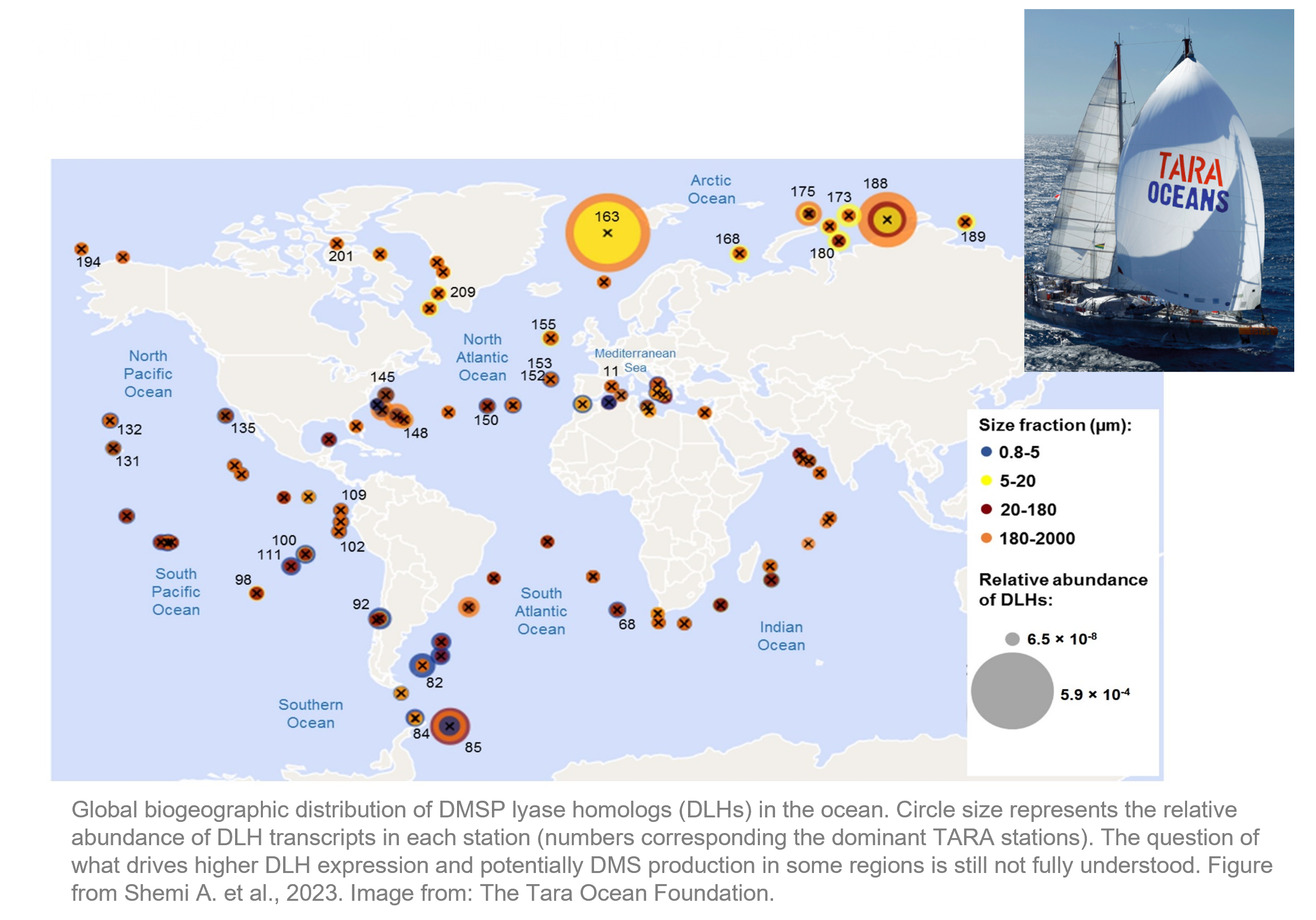 Our new paper in ISME Communications provides new bioinformatic tools to study the role of the DMSP lyase enzyme in your favorite algal model. We define unique sequence motifs in the DMSP lyase protein, which help us to detect the fingerprint of this enzyme in the genomes of distantly related taxa. So far, haptophytes and dinoflagellates were considered as the sole algal groups producing this gas, together with the green macroalga Ulva. With a set of criteria (the motifs, as well as the conservation of a racemase domain and active-site cysteine residues) we were able to define potential DMSP lyase homologs in several diatoms, green microalgae and others - significantly enlarging the phylogenetic tree of this enzyme. Importantly, several new species that are predicted to possess the DMSP lyase enzyme can be genetically transformed, which opens new opportunity for genetic studies on the DMSP lyase enzyme. We further analyzed the expression levels of the new DMSP lyase homologs in the Tara oceans dataset, a meta-transcriptomic project across the global ocean. High abundances of transcripts were associated to dinoflagellates, haptophytes, diatoms and others, with some possible links to environmental factors in specific ecological niches (such as nutrient availability). Expression of the DMSP lyase enzyme was even detected in the dark deep ocean by several mixotrophic dinoflagellates (which both eat prey and perform photosynthesis). This raises a new hypothesis about the involvement of DMS in mixotrophic metabolism in dinoflagellates.
