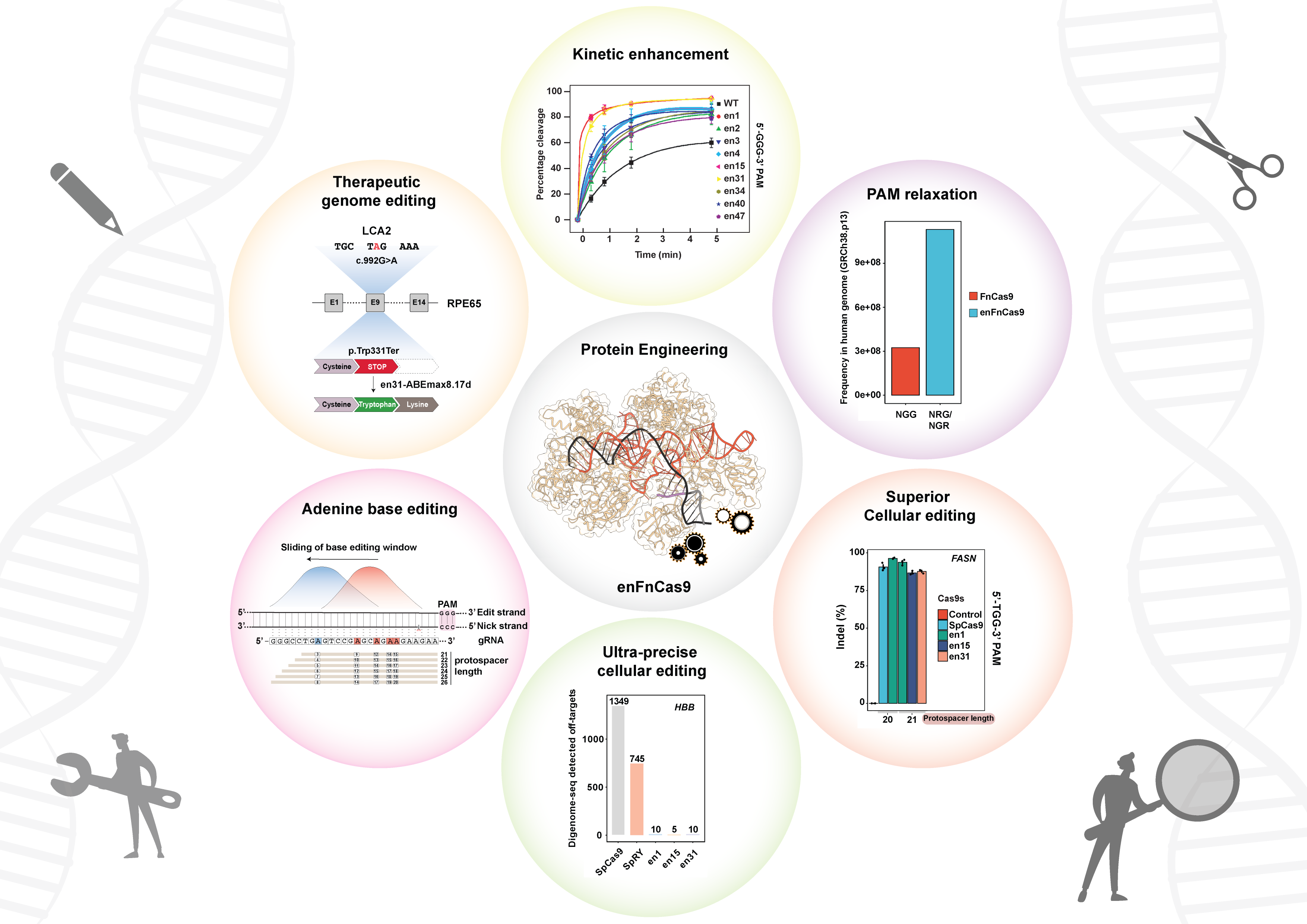 We showed robust cellular genome editing up to ~90% indel efficiency by enFnCas9 variants, mirroring the efficiency of SpCas9 (Fig. 1). These variants comfortably outperformed the high-fidelity SpCas9 variants both in editing efficiency and specificity even at the highly promiscuous single-mismatch containing off-target. Furthermore, enFnCas9 variants exhibited remarkable genome-wide specificity in human cells, where SpCas9 and PAM-flexible SpRY variants showed up to ~1300-fold and ~700-fold higher off-targeting, respectively, compared to enFnCas9 variants, as seen in Digenome-seq studies aimed at in vitro identification of potential off-targets in the genome (Fig. 1). Notably, enFnCas9 variants achieved high specificity despite being able to induce robust on-target efficiency in human cells, underscoring its superior properties as a potent genome editor.
