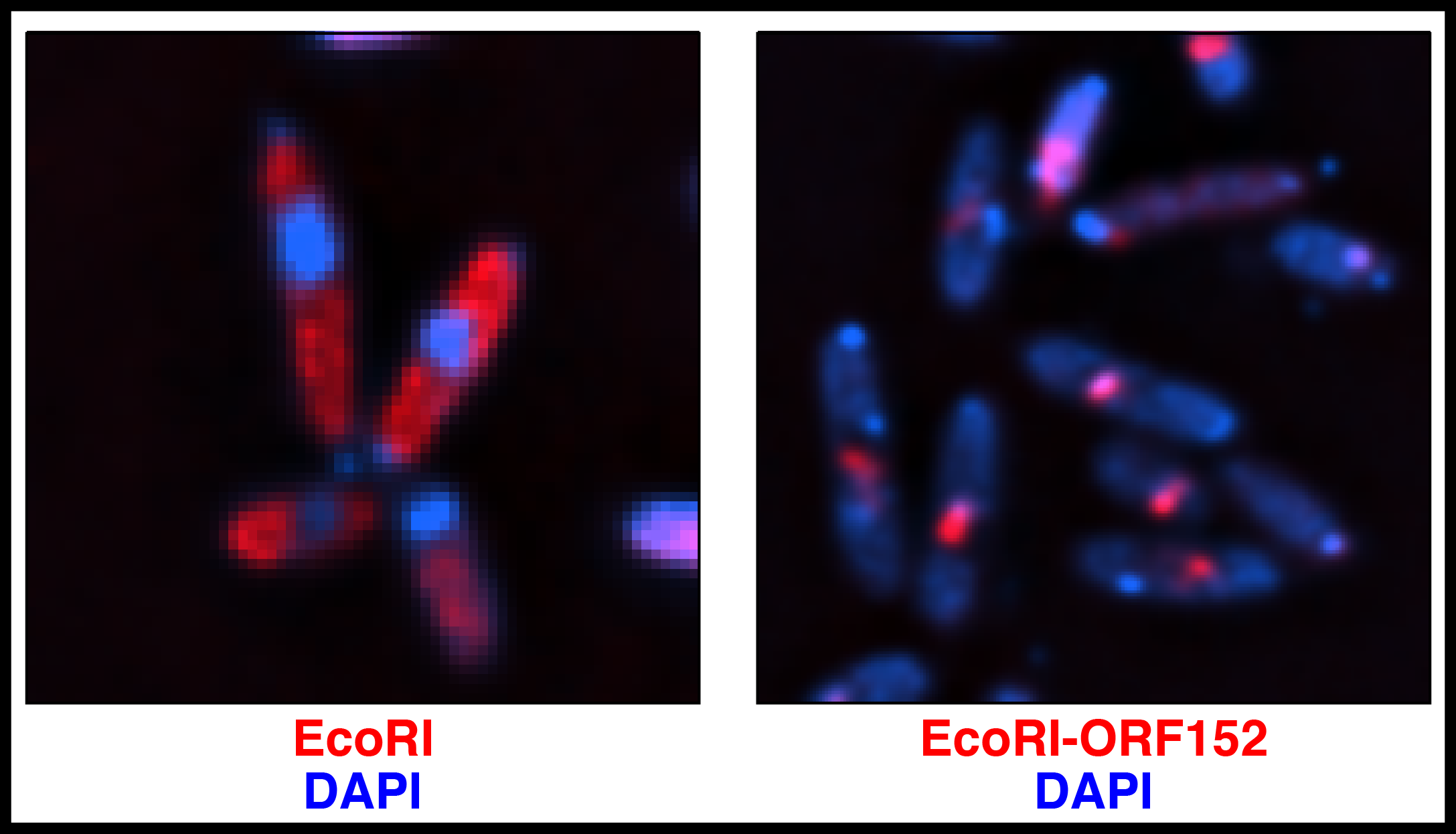 Figure 1: P. aeruginosa cells infected with ΦKZ expressing EcoRI (red) and stained for DNA (DAPI, blue). EcoRI-ORF152 fusion accesses the phage DNA and terminates the infection, while EcoRI is excluded.