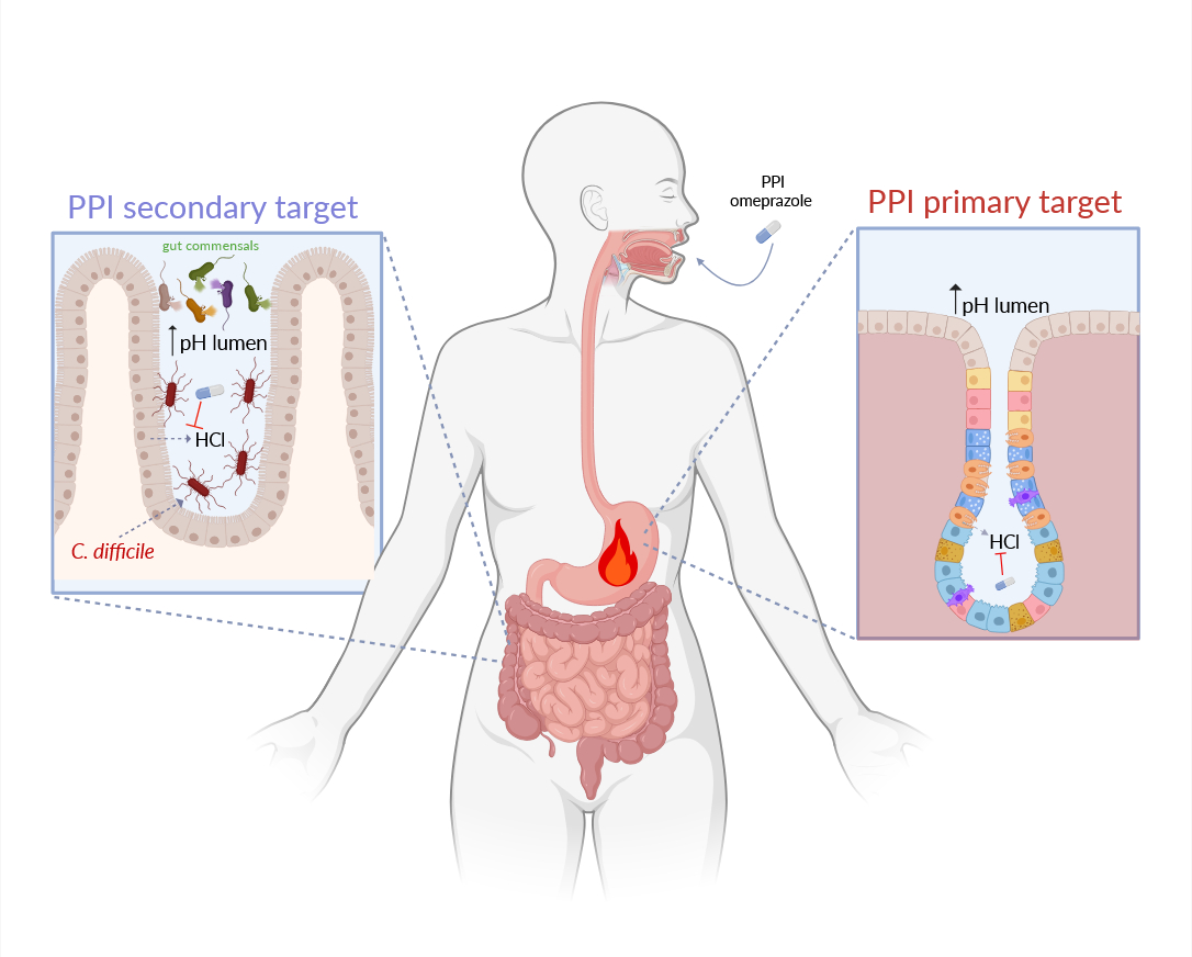 PPIs are among the most prescribed drugs worldwide: in the US alone, the PPI omeprazole was ranked the ninth best-selling drug in 2022 [2]. are generally indicated for treating infections with the bacterial pathogen Helicobacter pylori, gastroesophageal reflux disease, and gastric ulcers. However, since they are also available over the counter, in 50% of the cases, PPIs are used by people who don´t actually need them [3]. They inhibit a pump responsible for making the stomach acidic, thus increasing the stomach´s pH. A similar pump is present in the last part of the intestine, the colon, where microbial communities are the most abundant. Lead authors Lisa Maier and Bastian Molitor speculated that PPIs could change the pH of the colon, thus compromising the viability of some of the microbes therein. This, in turn, could promote C. difficile infections (CDI), which is (in)famous for promptly filling the gap left by beneficial gut microbes. This occurs, for example, after antibiotic treatment, which damages the gut microbiome and increases the risk of CDI.