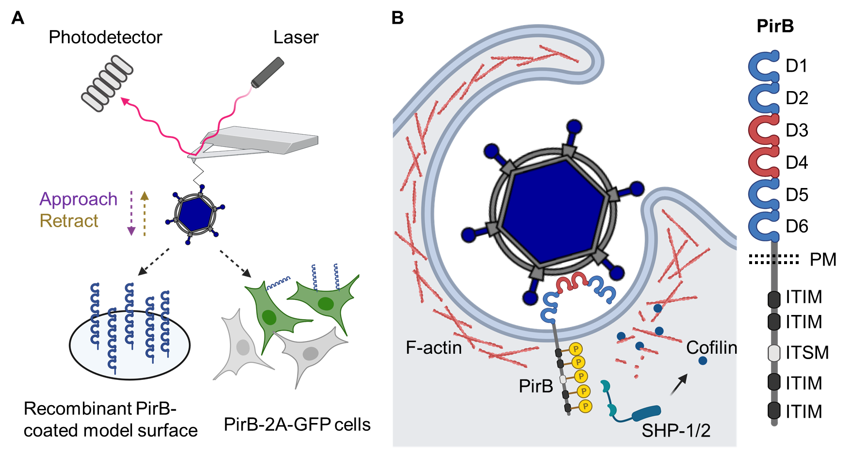 Figure 2. Molecular mechanism of reovirus-PirB interaction. (A) Kinetics and thermodynamics of reovirus-PirB interaction assessed using atomic force microscopy. (B) Model of PirB signaling triggered by reovirus attachment. Schematics were prepared using BioRender.