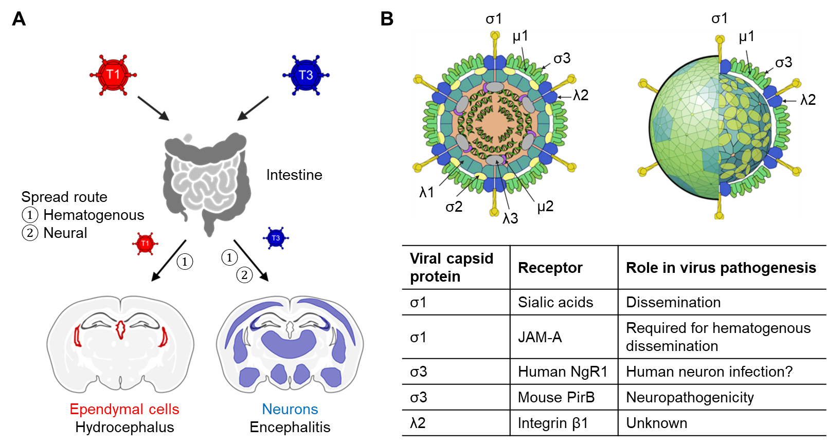 Figure 1. Reovirus pathogenesis and receptors. (A) Reovirus spread and neuropathogenesis in mice is serotype-dependent. Serotype 1, T1; Serotype 3, T3. (B) Reovirus proteins and their host receptors. The reovirus particle images were adapted from ones shown in ViralZone, SIB Swiss Institute of Bioinformatics with permission. Schematic and particle images were prepared using BioRender.
