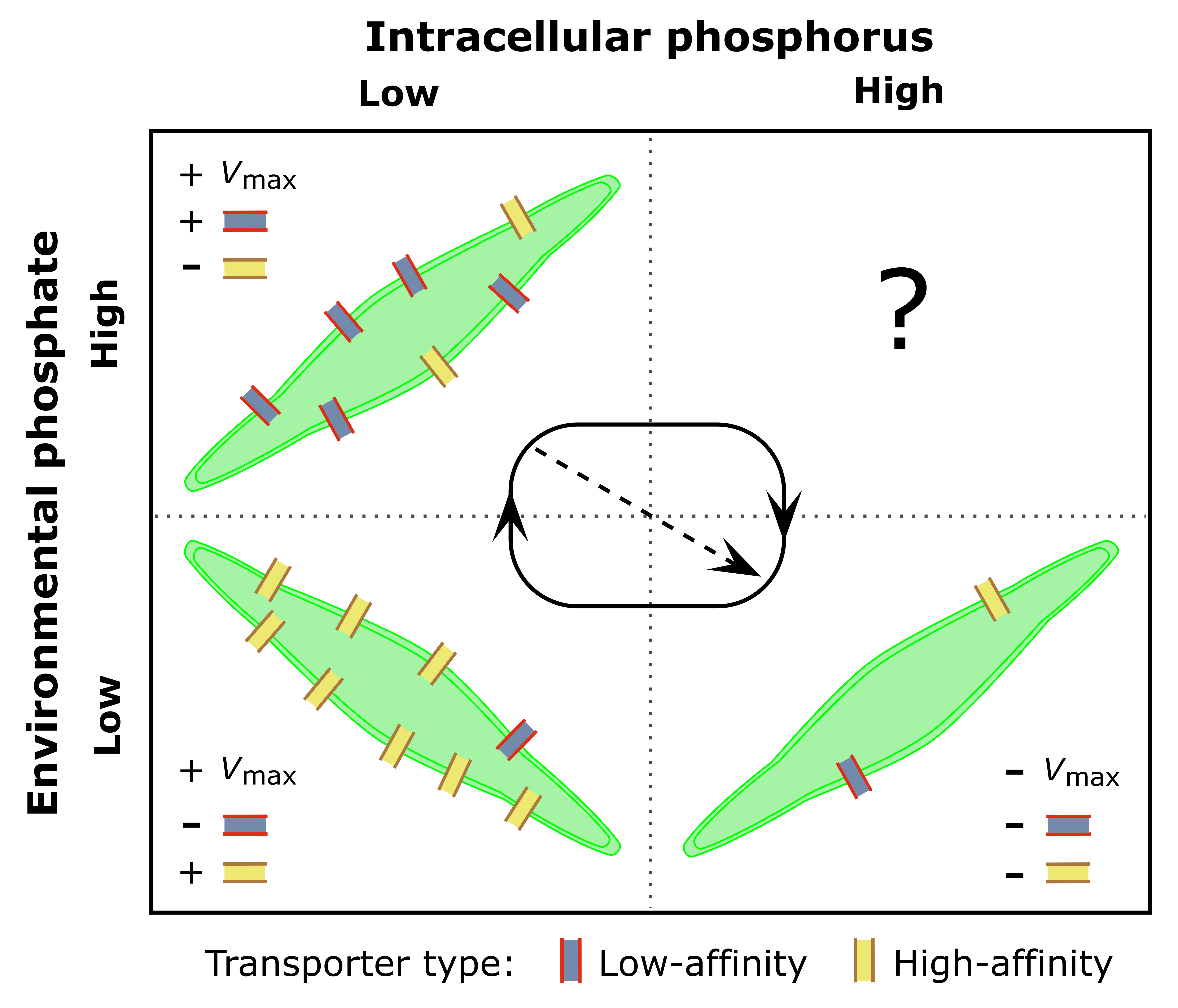 When we tried to reproduce the Vmax patterns observed in our experiments by using existing mathematical models, all our efforts were unsuccessful. It was only after considering that the nutrient uptake machinery was composed by two different types of nutrient transporters, upregulated after phosphate pulses and at low intracellular phosphorus levels, respectively, that we could reproduce such empirical patterns. Eureka! Most importantly, our mathematical model enabled us to provide the “whole” movie, and not only the snapshots that we got from our laboratory measurements. In this way, the changes in Vmax could be understood as a temporal succession of acclimation responses, promoted by the sequential upregulation and downregulation of the different components (i.e. transporter types) of the nutrient uptake machinery, which improved the cell’s capacity to take advantage of nutrient pulses or exploit oligotrophic environments.