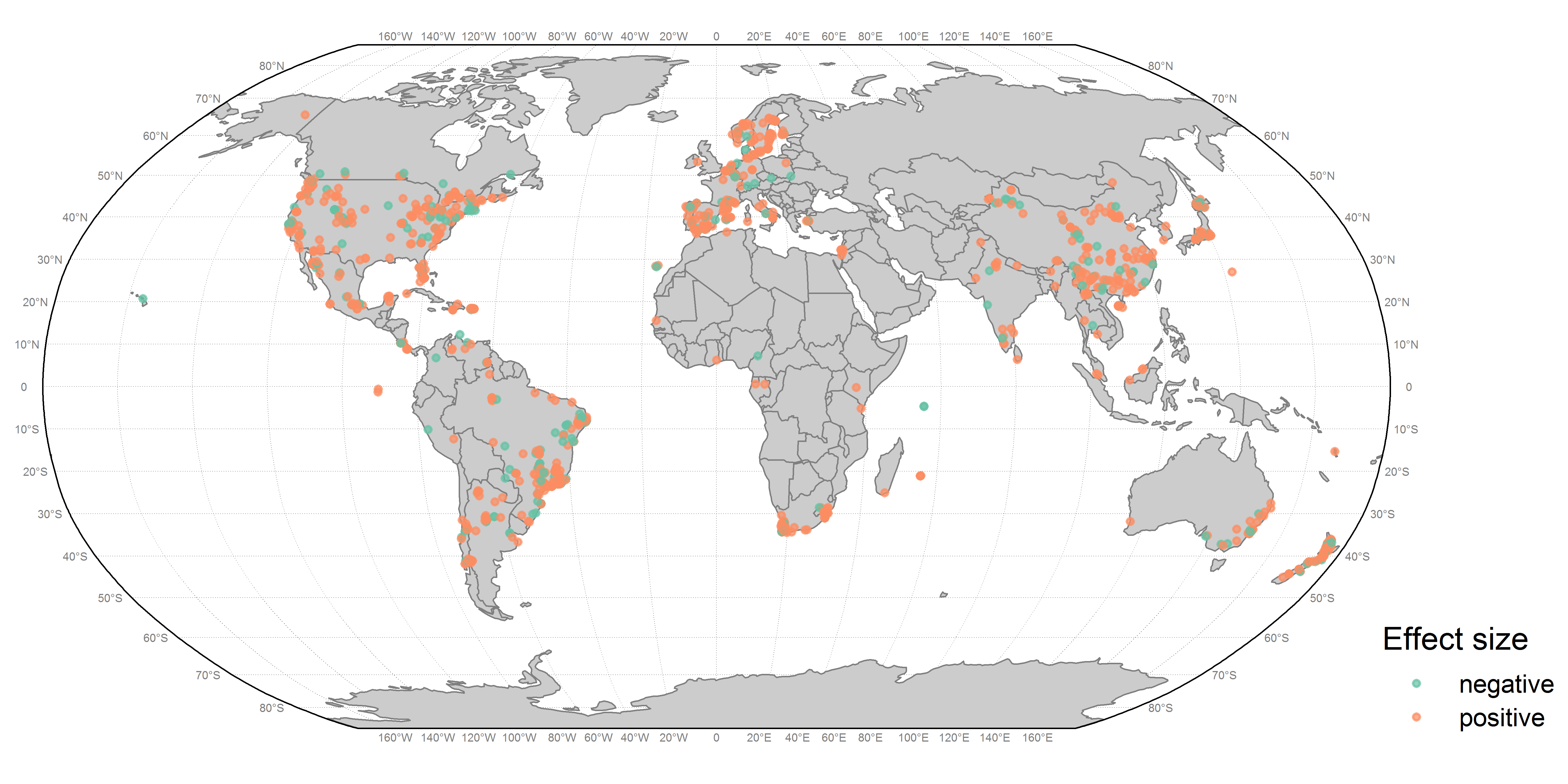 Map showing the location of published pollen limitation studies in the GLoPL dataset. Orange points indicate a positive effect size (i.e. pollen limitation) and green points indicate an effect size of zero or below (i.e. no pollen limitation). Credit: Valentin Ştefan.