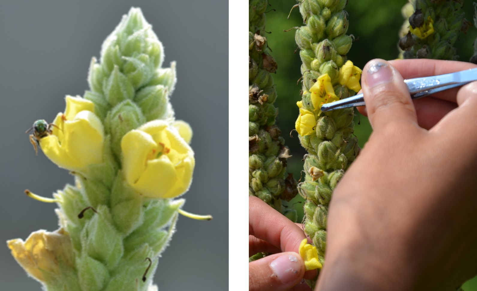 A pollen supplementation experiment where a naturally pollinated flower is compared to a hand-supplemented flower. Credit: Amibeth Thompson.