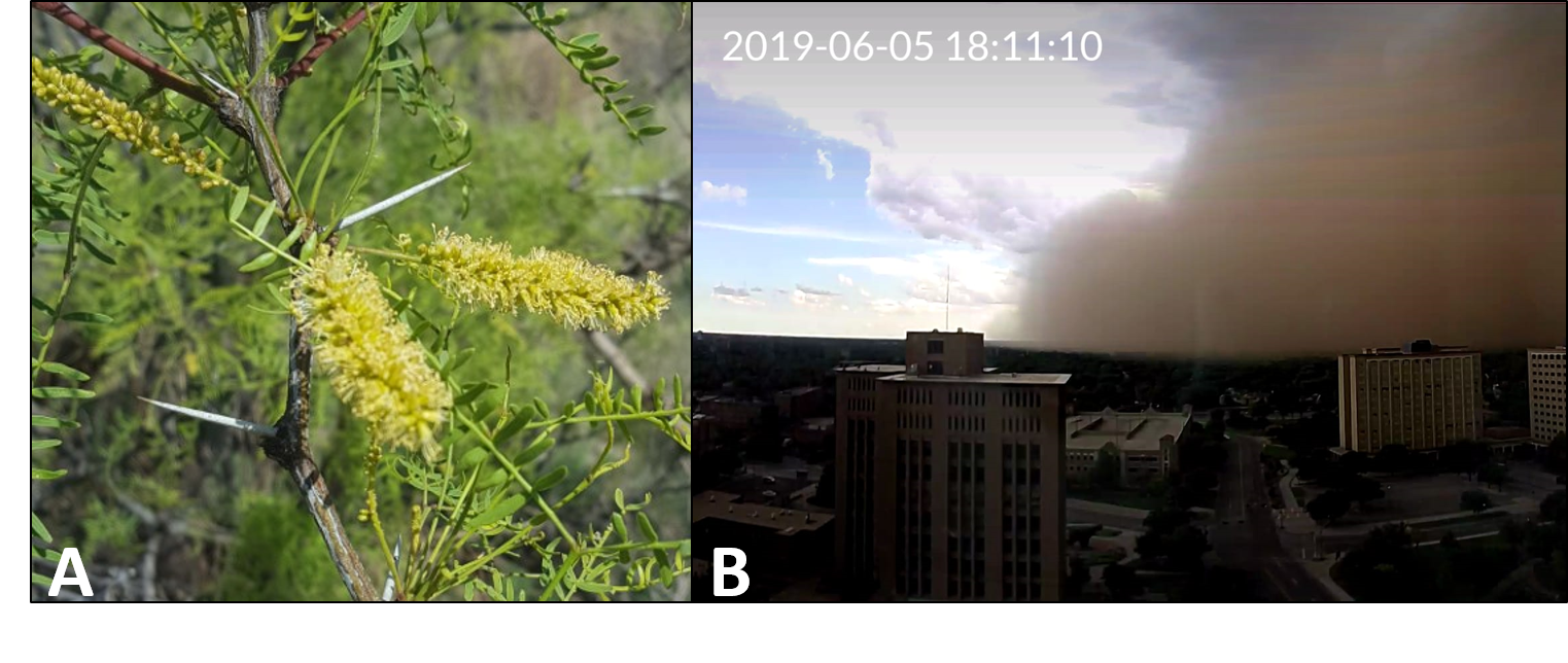 Figure 1. (A) Honey mesquite thorns (photo credit: Dr. Robert Cox) and (B) Haboob dust storm moving across Lubbock Texas (photo credit: Dr. Karin Ardon-Dryer)
