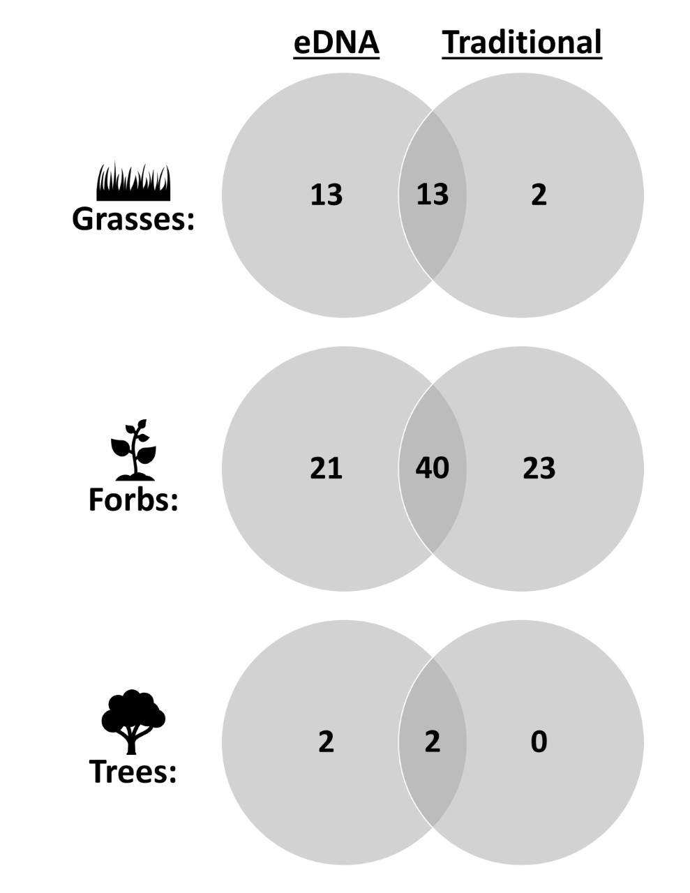 Figure 3. Venn diagram displaying the number of (A) grasses, (B) forbs, (C) and trees that were found by the eDNA and traditional methods alone and together