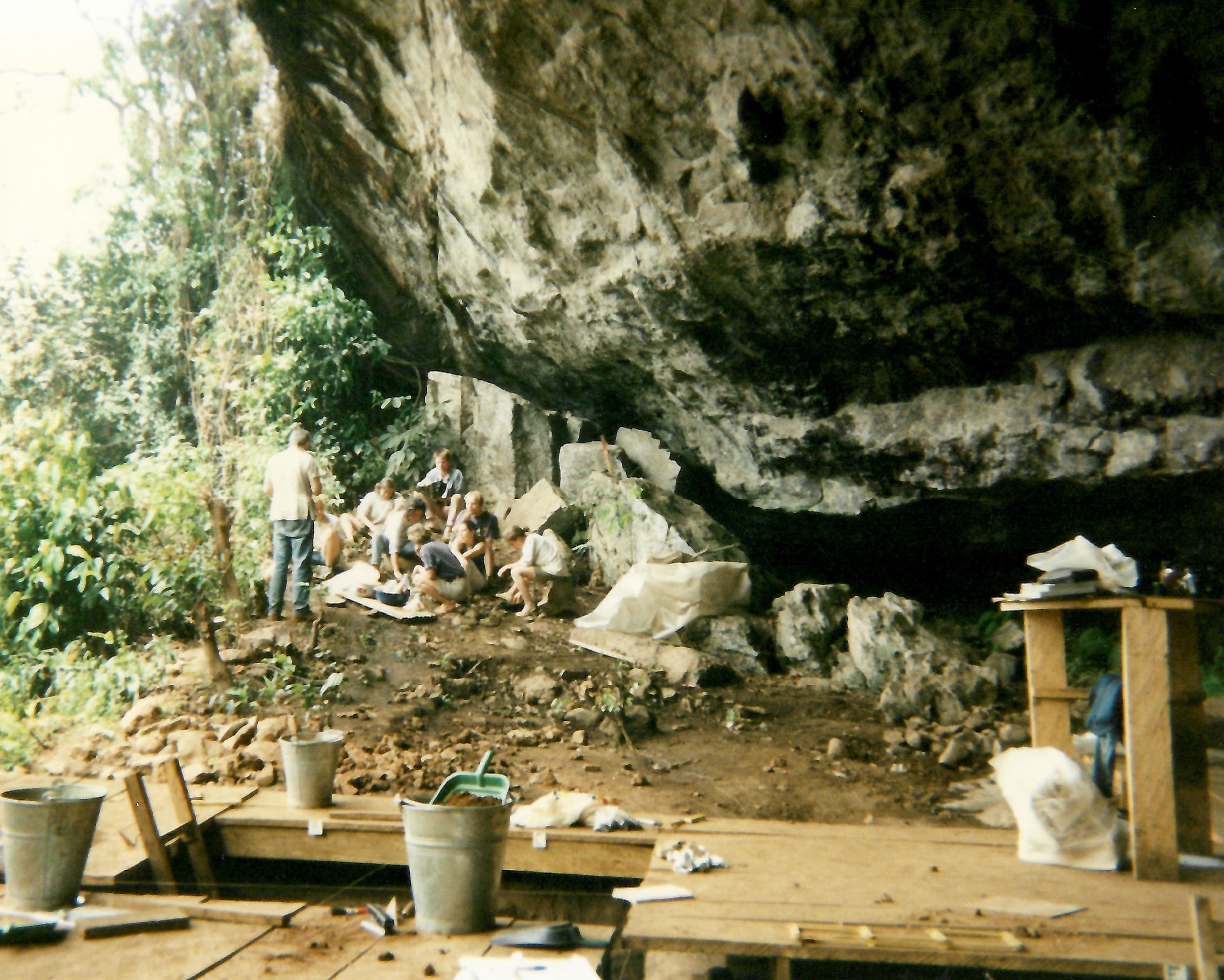 Reminiscing about the past, I vividly remember a series of field excavations that I did in France, Belgium, Egypt, Jordan, Israel and Cameroon. One of them influenced me more than any other. This was an archaeological excavation in the Grassfields of North-West Cameroon, at the site called Shum Laka. In the 1990s, I was a student and a collaborateur scientifique at the Institut Royal des Sciences Naturelles de Belgique. Having finished my M.Sc. at the University of Bradford in human osteology and palaeopathology in 1992, I sought work opportunities outside Europe to use my newly learnt skills. Late 1993, I joined the team of Professor Pierre de Maret (Université Libre de Bruxelles), who had from 1991 been excavating the Shum Laka rockshelter in collaboration with Prof. Raymond Asombang (University of Yaoundé). This was my first excavation in Africa, and I realized how important the region and the site were for African Archaeology and studies on population history. Already then, the Grassfields were considered the cradle of the Bantu languages, but also as a key area for the development of pre-agricultural economies, which later spread to the whole sub-continent. The site itself, located in a mixed landscape of savannah-forest, is nested on the slope of ancient volcanic mountains. Despite a tropical climate, not ideal for bone preservation, it revealed surprising discoveries (Figure 1).