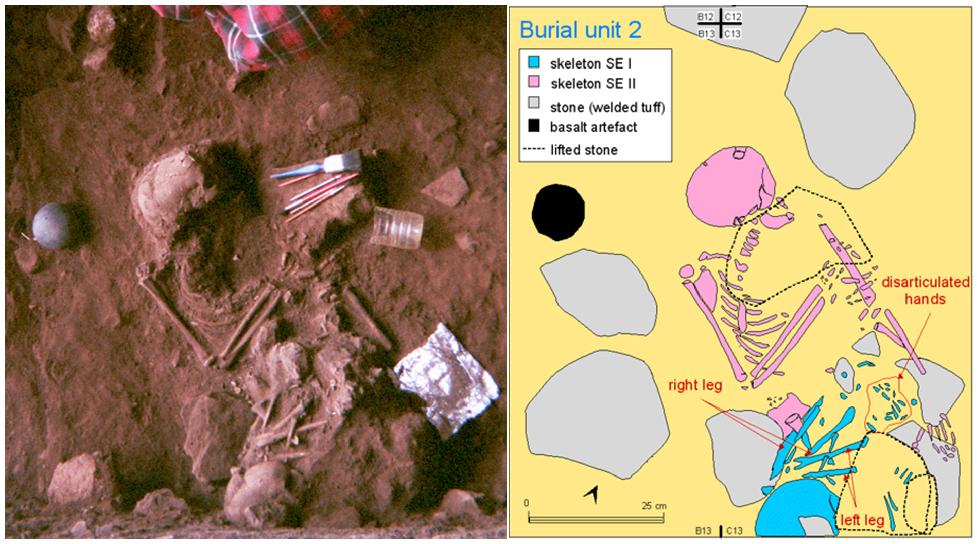 Figure 3. View of the excavation (left) and drawing (right) of a double burial containing two children (Burial Unit 2). Photo and drawing credits: Isabelle Ribot