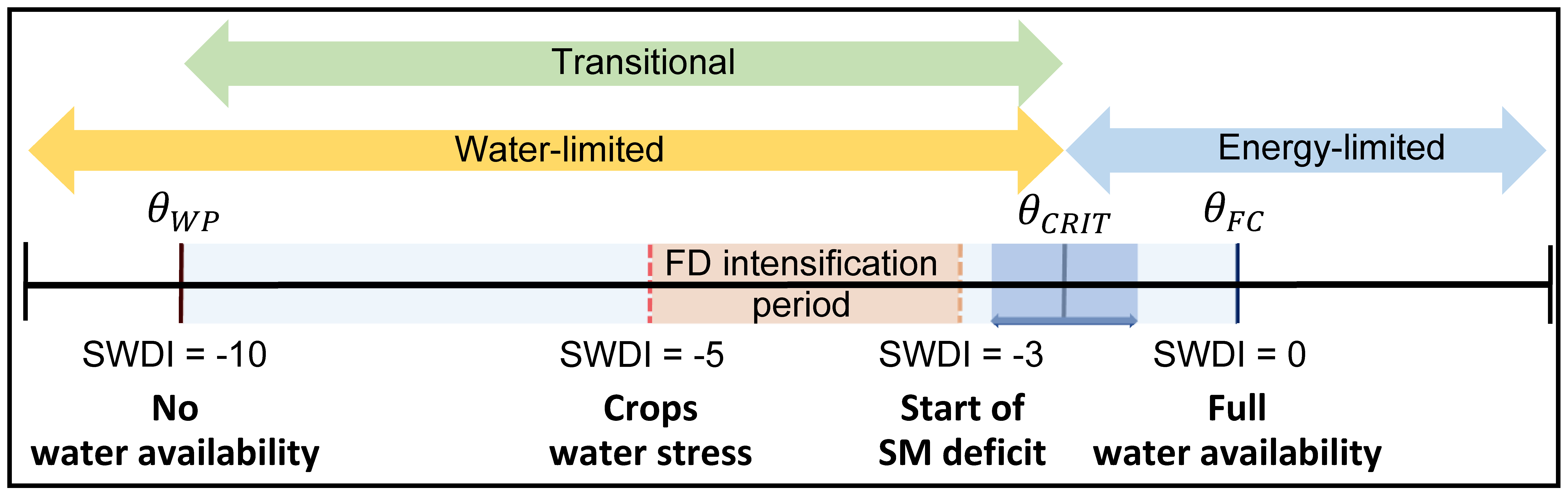 The proposed method utilizes the root-zone soil moisture and two soil hydraulic properties, namely field capacity and wilting point, to capture the rapid depletion of soil moisture, along with vegetation stress that severely impacts agriculture and ecosystems. To detect such occurrences, we suggest using the well-known Soil Water Deficit Index (SWDI) along with a threshold range within the transitional regime. The upper SWDI threshold marks the initiation of the soil moisture deficit, while the lower SWDI threshold indicates water stress conditions on crops. This approach is illustrated schematically in Figure 1.