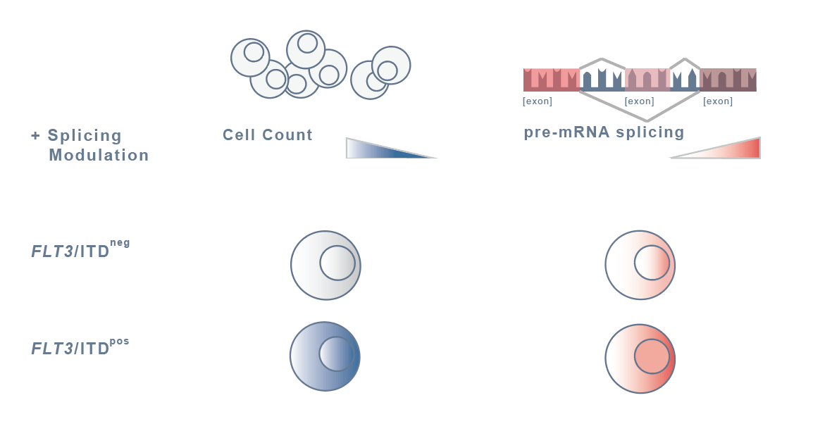 I continued working on several projects using splicing modulation. In our publication in Leukemia we demonstrate that AML patients carrying FLT3/ITD showed increased sensitivity to SF3B1 modulators, such as E7107, and its newly developed analogue H3B-8800. In particular, several lines of evidence from cell lines and primary patient material indicate that splicing modulation holds great potential as a novel therapeutic option for FLT3/ITDpos AML. In particular cells with high allelic ratio (AR) and/or long ITD length, subsets of AML that responds poorly to current treatments, showed increased sensitivity. While we left no stone unturned, we could not resolve the exact mechanism of the increased sensitivity to SF3B1 modulators in FLT3/ITD positive cells. It does not seem to be a differential splicing pattern or differential gene expression of splicing regulators. Neither a difference in expression of MYC or MCL1 which have previously been indicated as molecular mechanisms.2,3 Nonetheless, our results show that SF3B1 modulation indirectly decreased FLT3 expression, which may partly explain the induction of cell death, particularly in cells that rely on FLT3/ITD signal transduction for their proliferation and survival. Hopefully these data will stimulate further validation in the future. Meanwhile, I am very excited to share that even in a cell characterised by a recurrent mutation, the process of splicing seems to be essential for survival.