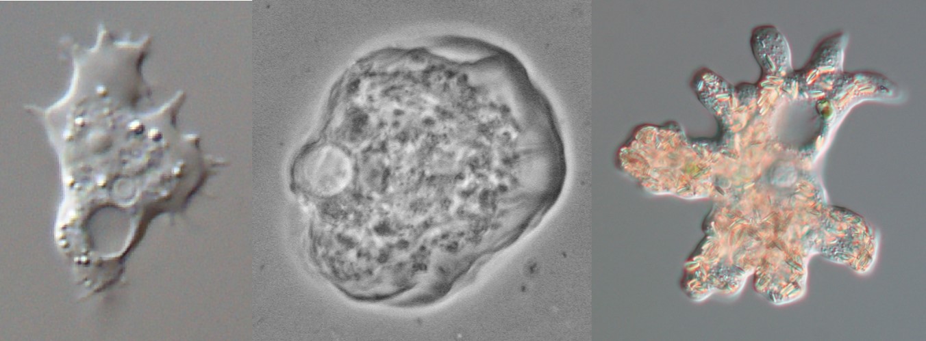 Some common soil protists, here represented by three common amoebae. From left to right Acanthamoeba sp., Thecamoeba similis and Deuteramoeba mycophaga. Pictures provided by Alexey Smirnov