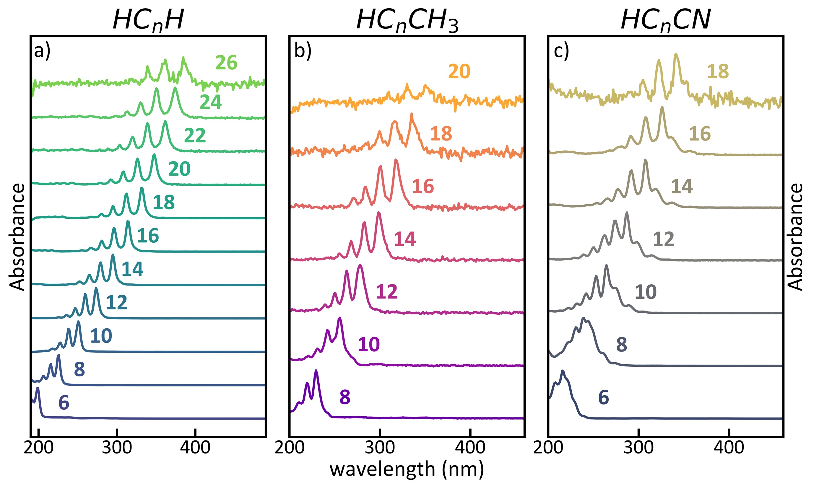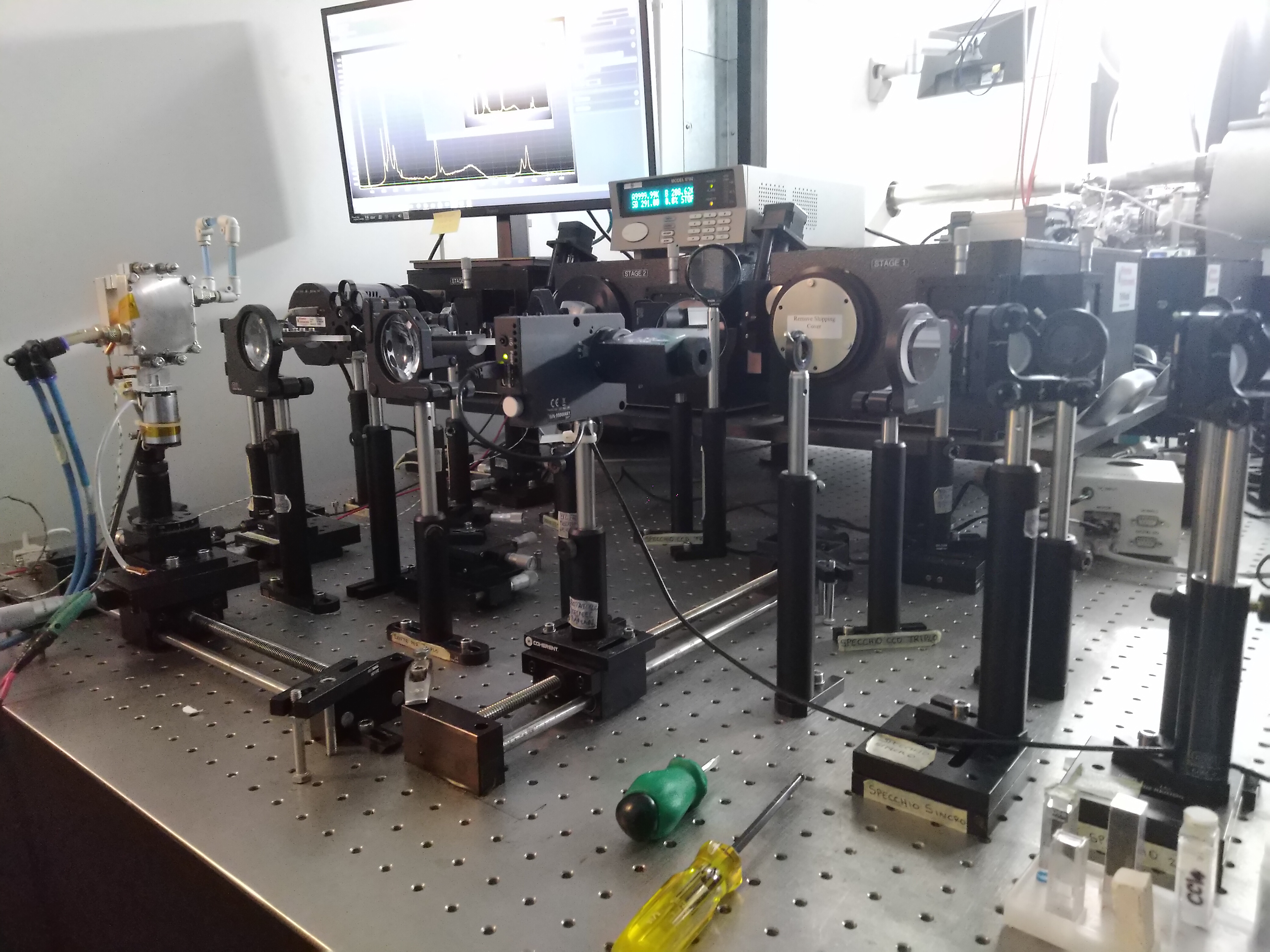 Reply: we are going on in the investigation of these systems. We have already done another beamtime experiment at ELETTRA with data we are analyzing right now. We can synthesize carbon wires up to 26 carbon atoms in length and with different terminations. Now we are focusing on the effect of the termination on the properties of these systems. In parallel we are looking for an experimental set-up able to perform UV Resonance Raman in a wider range (i.e., above 270 nm) to allow us to investigate longer wires (see image below).