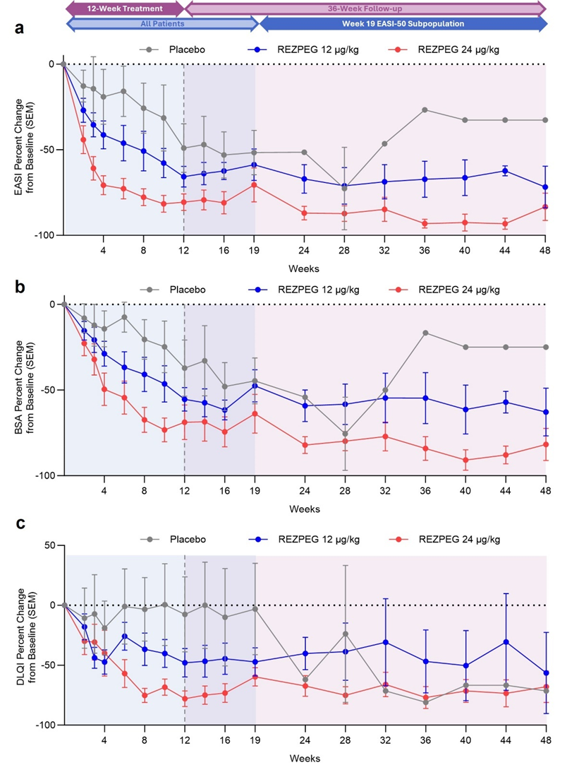 At the 12-week key efficacy endpoint, we were excited to see that PsO patients treated with 24 µg/kg REZPEG demonstrated improvements from baseline in Psoriasis Area and Severity Index. Additionally, AD patients REZPEG demonstrated significant improvements in Eczema Area and Severity Index (EASI), body surface area (BSA), and Dermatology Life Quality Index (DLQI) after 12 weeks of treatment (Figure 1). Even more remarkably, these responses were durable for an additional 36 weeks after completing treatment at week 12.