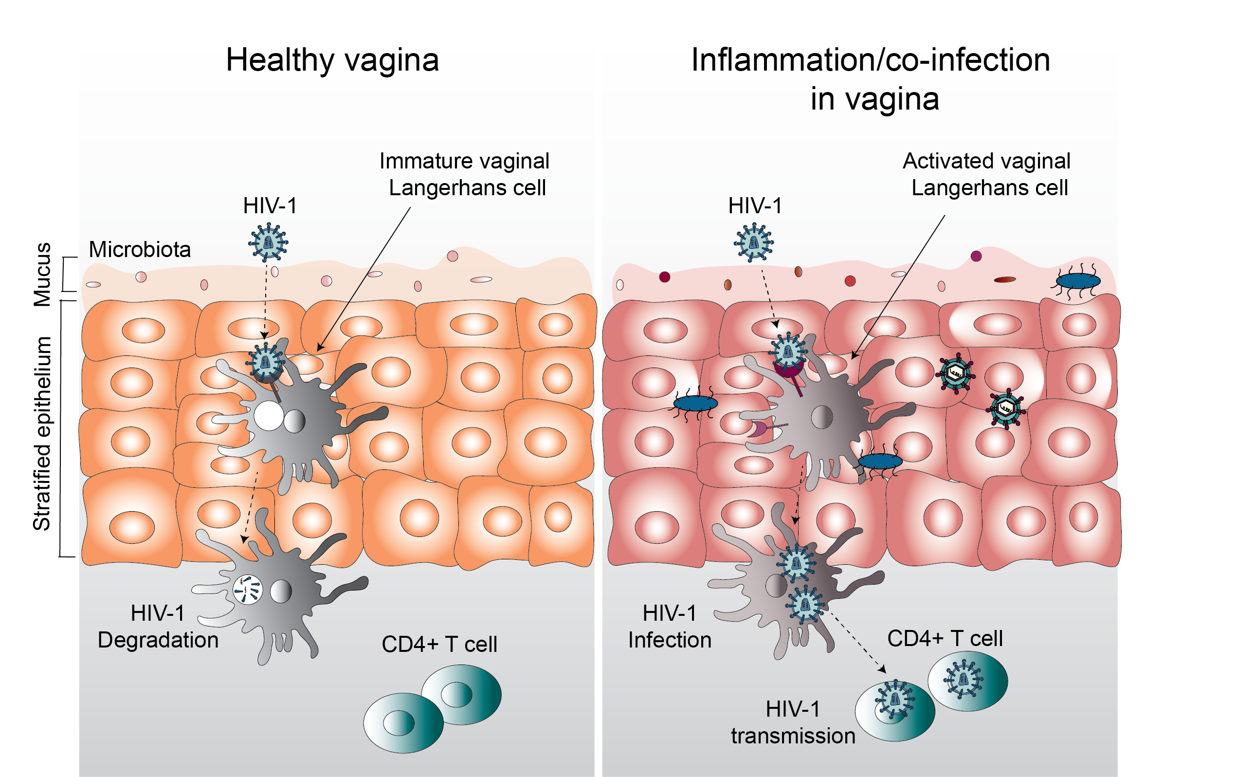 Similar to what we observed in skin, LCs are also present in the vaginal mucosa where LCs populate the outer epithelial layer and are among the first cells to interact with HIV-1 during sexual contact. Importantly, LCs can be present in two different states: immature and activated. Their activation state determines whether LCs prevent or perpetuate HIV-1 infection. Immature LCs are highly efficient protectors against HIV-1 through capture and subsequent degradation of viral particles. Activated LCs however become infected by HIV-1, transmit the unharmed virus to T cells in nearby lymph nodes and hence contribute to further infection and HIV-1 dissemination.