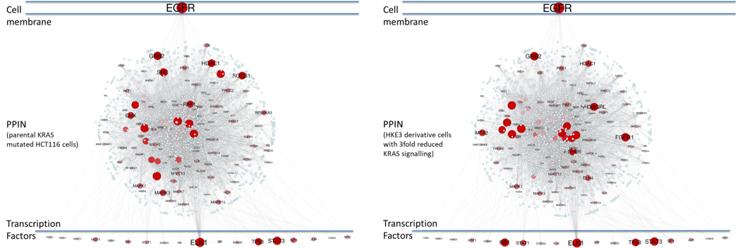 Signal flow from the EGFR to nuclear transcription factors through the PPIN network in parental HCT116 cells (left) and derivative HKE3 cells (right), where the dosage of mutant KRAS signalling is reduced threefold4.