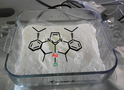 In that context, we describe in details the multigram synthesis of the most common mononuclear N-heterocyclic carbene gold(I) chloride complexes bearing the N,N′-bis-(2,4,6-trimethylphenyl)imidazol-2-ylidene (IMes), N,N′-bis(2,6-diisopropylphenyl)imidazol-2-ylidene (IPr) and N,N′-bis(2,6-bis(diphenylmethyl)-4-methylphenyl)imidazol-2-ylidene (IPr*) ligands. This straightforward methodology is conducted under air and possesses considerable advantages over alternative routes, such as the use of a sustainable reaction solvent, minimal amounts of a mild base and commercially available or easily obtained starting materials.