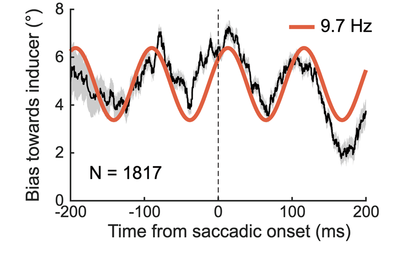 The bias, however, was not constant, but waxed and waned at alpha frequencies (around 10 Hz), in synchrony with the saccadic eye-movements. The oscillation was strong and highly significant, with amplitude about half that of the mean biasing effect. The black curve in the figure shows the average bias in observer judgments, as a function of time before or after the onset of the saccade (zero in the graph). Bias clearly oscillates over time, both before and after the onset of the saccade. The red curve shows the best fitting sinusoid, which had a frequency of 9.7 Hz.