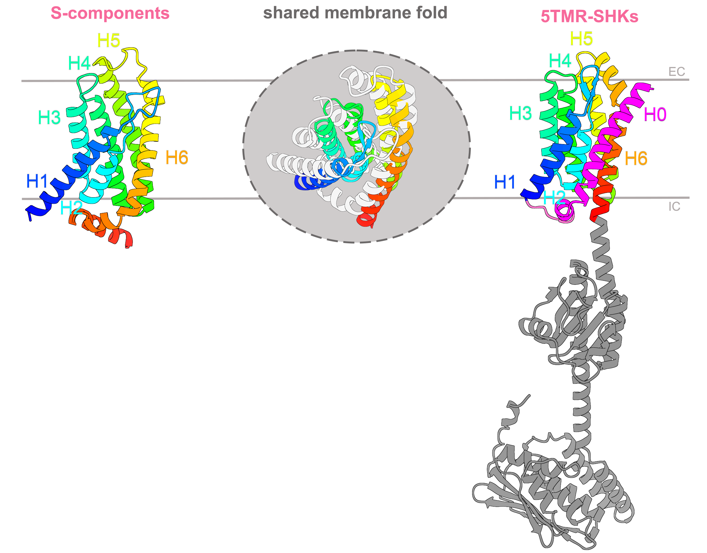 Figure 1 The shared fold between S-components and 5TMR-sensor histidine kinases. Structural similarity search via Foldseek highlighted that substrate-binding proteins involved in membrane transport and the membrane domain of 5TMR-receptors with the function of signal sensing, share the same fold of six membrane-spanning α-helices (H1-H6, in rainbow). The 5TMR-domain has an additional helix H0 at the N-terminus (in magenta), and is linked at the C-terminus to soluble domains needed for signal transduction. The superimposition of the two domains is shown at the center of the figure, with the S-component fold shown in light gray, while helix 0 of 5TMR-fold is omitted. IC and EC indicate the intracellular and extracellular boundaries of the cell membrane. The AlfaFold structures used in this illustration correspond to RibU (identifier AF-Q8Y5W0-F1) and YpdA (identifier AF-P0AA93-F1 ).
