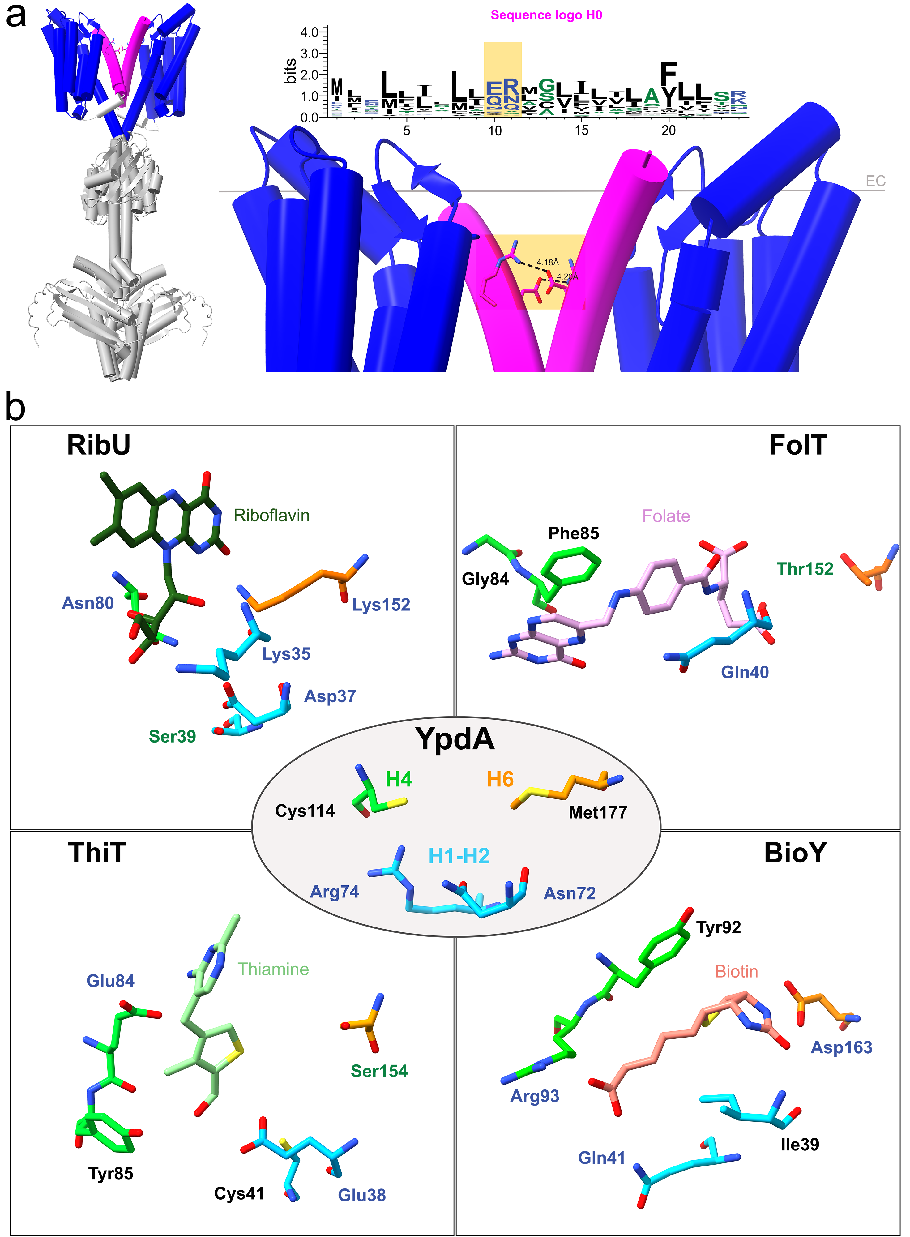 Figure 2 Structural features of 5TMR-sensor histidine kinases. a The role of helix 0 (H0) in receptor dimerization. 5TMR-SHKs have a proposed homodimeric state in vivo, here shown (left of the panel) in the form of the AI-generated prediction of YpdA. While soluble domains (in light gray) enable dimerization of the receptor in correspondence of the regions involved in signal transduction, interactions must also occur at the membrane interphase. The 5TMR-domain (in blue) is linked to an additional helix H0 at the N-terminus (in magenta), which we hypothesized being required for dimerization at the level of the membrane. Besides regularly spaced leucine residues that can establish hydrophobic interactions, H0 has two conserved polar amino acids candidate for the formation of an intramembranous salt bridge (shaded in orange). b Comparison between conserved amino acids in 5TMR-SHKs and amino acids involved in substrate binding for different S-components. The AlphaFold-structure of YpdA from E. coli (PDB entry: AF-P0AA93-F1) was superimposed with experimentally determined structures of S-components RibU, FolT, ThiT and BioY (PDB entries: 5KBW, 4POP, 5D0Y, 4DVE) in complex with their substrates. Asn72, Arg74, Cys114 and Met177 of the receptor YpdA resemble the tridimensional organization of particular amino acid residues needed for substrate binding in different S-components, regardless of their substrate specificity. These amino acids are located in the extracellular loop between helices 1 and 2 (in cyan), helix 4 (green) and helix 6 (in orange), and retain the same orientation towards the substrate pocket, albeit having distinct roles in substrate binding.