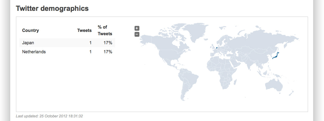 And although we can’t link directly to tweets about a paper (complain to Twitter, not to us), you can see the geographical breakdown of them. The paper associated with the screenshots above doesn’t have a lot (see below), but here’s an example of one that does — scroll down to see the map!