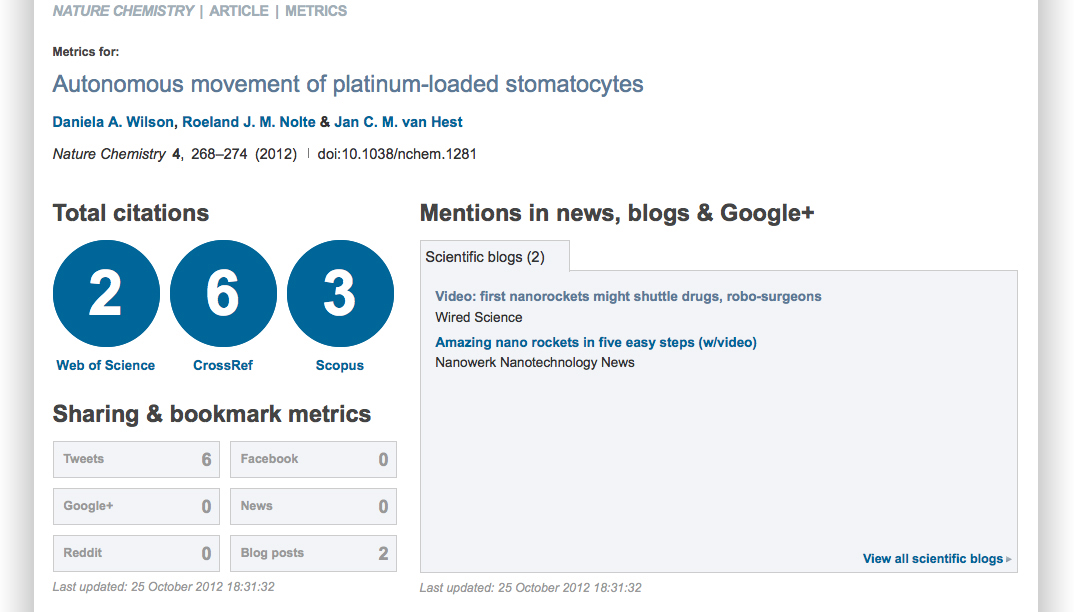 You might have noticed one or two excited tweets from us earlier today about this, but if not, here it is again: article-level metrics are now available on 20 journals on nature.com, including us! — the press release is here.