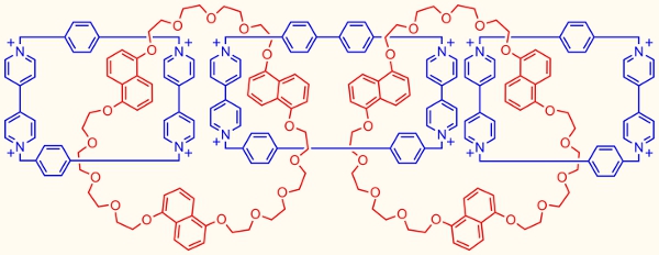 Alternatively, how about making a molecule that contains five interlocked rings — just like the Olympic symbol? This idea was actually first proposed way back in 1960 by van Gulick (more on this at the end of the post) and the experimental realization was reported in the international edition of Angewandte Chemie in 1994. It came out of the labs of Fraser Stoddart (disclaimer: I did my PhD with Fraser and worked is his lab for many years, so I have a soft spot for interlocked molecules), but the main protagonist stood at the lab bench was David Amabilino, who is currently at the Institut de Ciència de Materials de Barcelona. The title of the paper is simply ‘Olympiadane’ (don’t you love scientific papers with one-word titles?). The structure of this [5]catenane is shown below – Wikipedia link here.