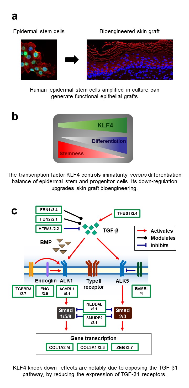Firstly, a stable lentiviral-based KLF4 knock-down (KD) approach was developed and used as a proof-of-concept to study the properties of KLF4KD versus KLF4 wild-type Ker-Ads. Using long-term cultures and clonal assays, we found that reduced KLF4 expression in Ker-Ads increased ‘stemness’ and ex vivo amplification. Importantly, KLF4KD cells exhibited an improved grafting capacity in a serial skin grafting model (a). To explore the mechanisms responsible for these gains-of-function, the interplay between KLF4 and TGF-β1 was investigated. Treatment of KLF4WT keratinocytes with TGF-β1 induced differentiation, but this process was impaired in KLF4KD, notably through down-regulation of TGF-β1 receptor expression, leading to maintenance of a more immature cellular and molecular phenotype. As a consequence, expression of stemness transcripts and immaturity-associated markers were up-modulated in KLF4KD keratinocytes, whereas keratinocyte differentiation program was shut-down (b-c).