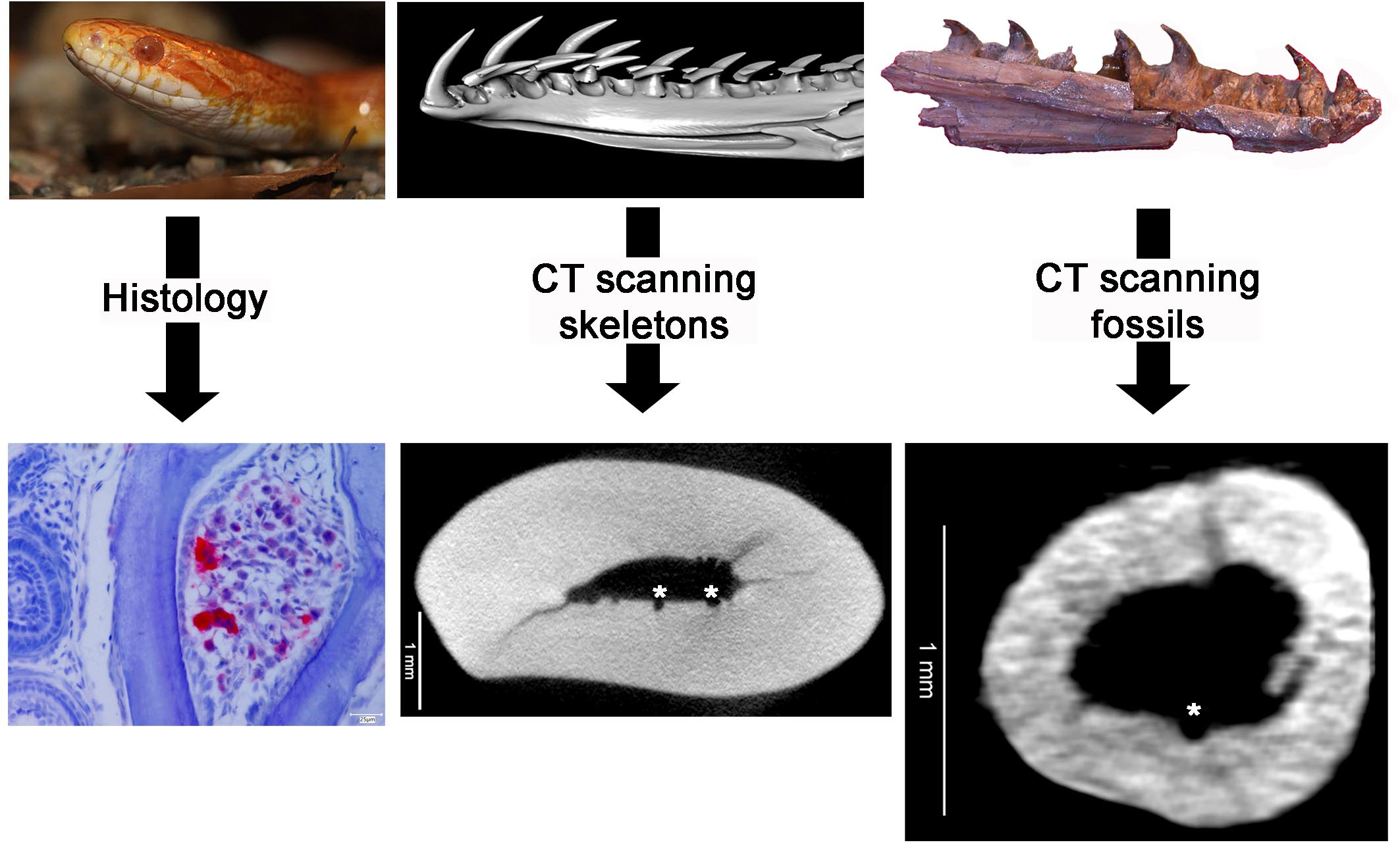A cells-to-fossils approach to studying snake tooth replacement. We used special histological staining to see the cells that resorb corn snake teeth from the inside (left), to help us identify the signs of tooth replacement we should see in scans of modern snakes, like this python (middle images), and one of the world’s oldest snake fossils, Portugalophis (right images), which is only known from a few bones. Credit for corn snake image: commons.wikimedia.org/wiki/User:Danny_S./_Herpetofauna