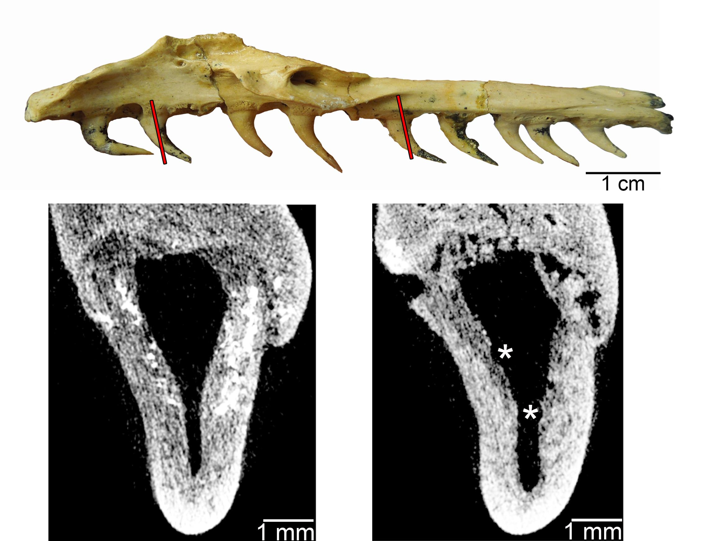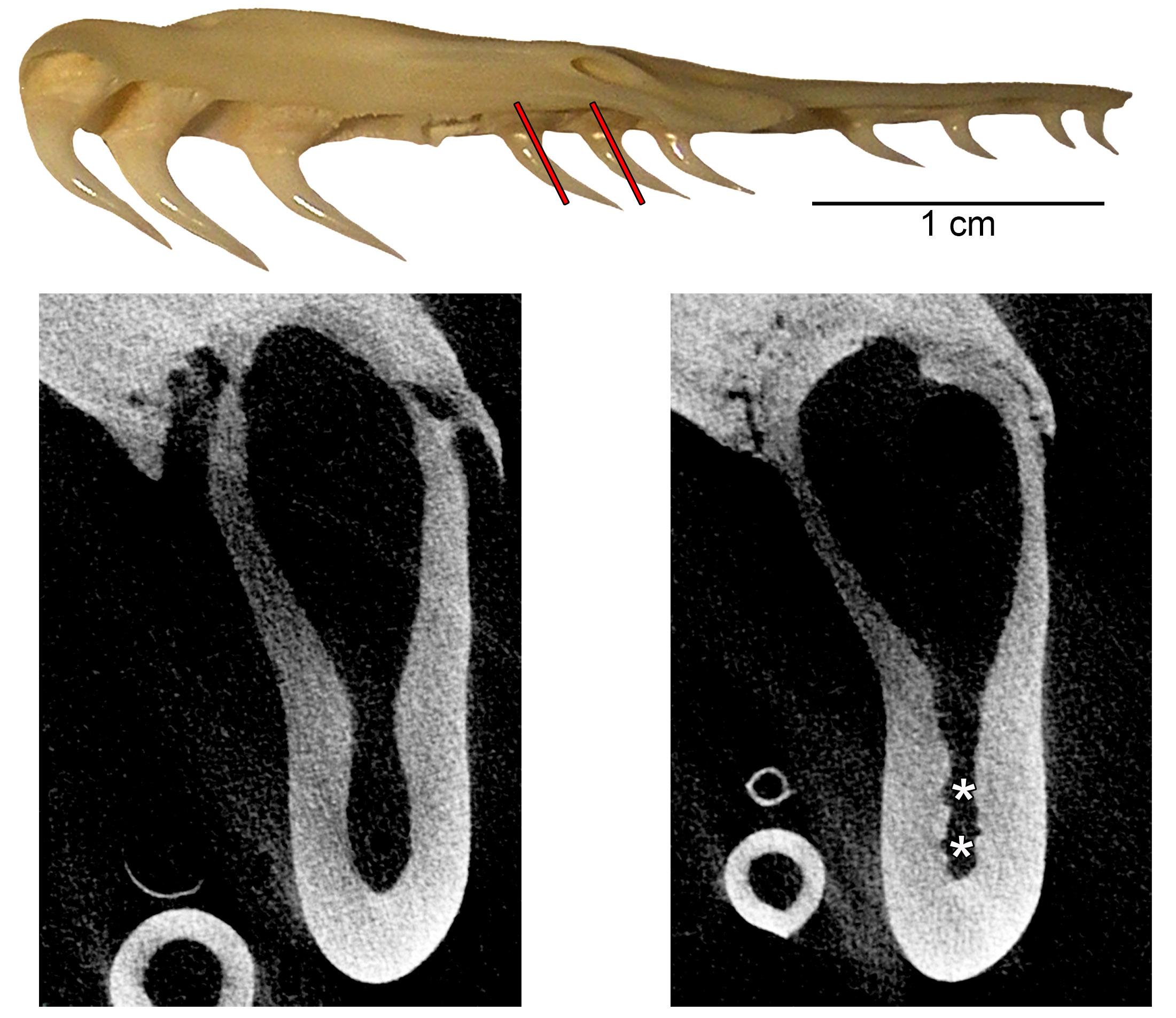 CT scans looking inside a new tooth (left scan image) and a tooth in the process of being resorbed from the inside (right) in the fossil snake Yurlunggur. The asterisks mark the positions of the “bite marks” that were produced by odontoclasts when this snake was alive.