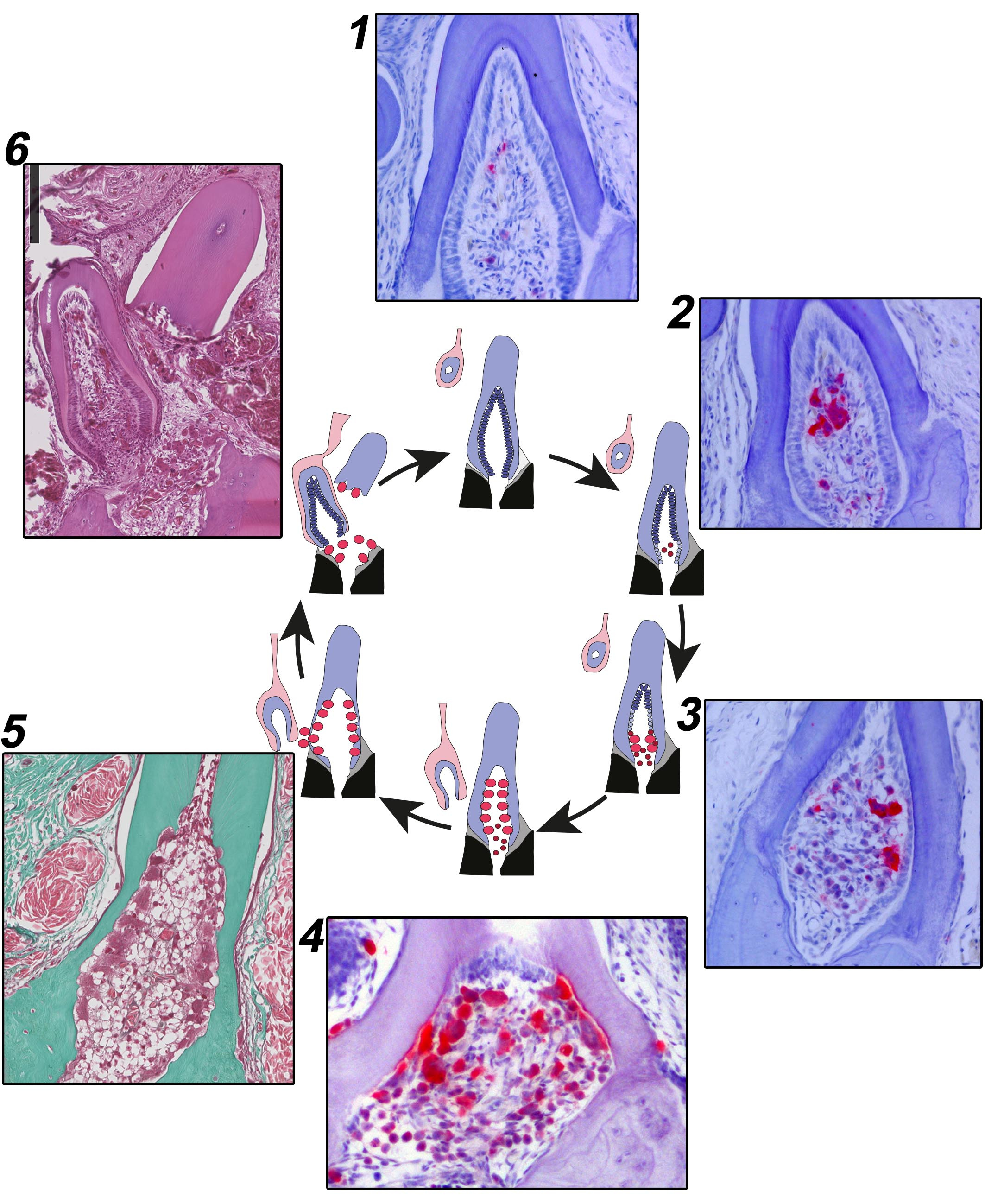 The replacement cycle of a snake tooth, patched together by examining thin sections of teeth at different stages. Teeth start out by attaching to the jaws, with the inside of the tooth still producing tooth tissues (1). Soon after, odontoclasts (red cells in 2-4) appear inside the tooth and start to displace the other cells in the pulp. Eventually, the odontoclasts start eating away at the hard tissues of the tooth from within (5), causing the old tooth to be shed (6). The thin sections in 1-4 were made by study coauthor Dr. Neal Anthwal.