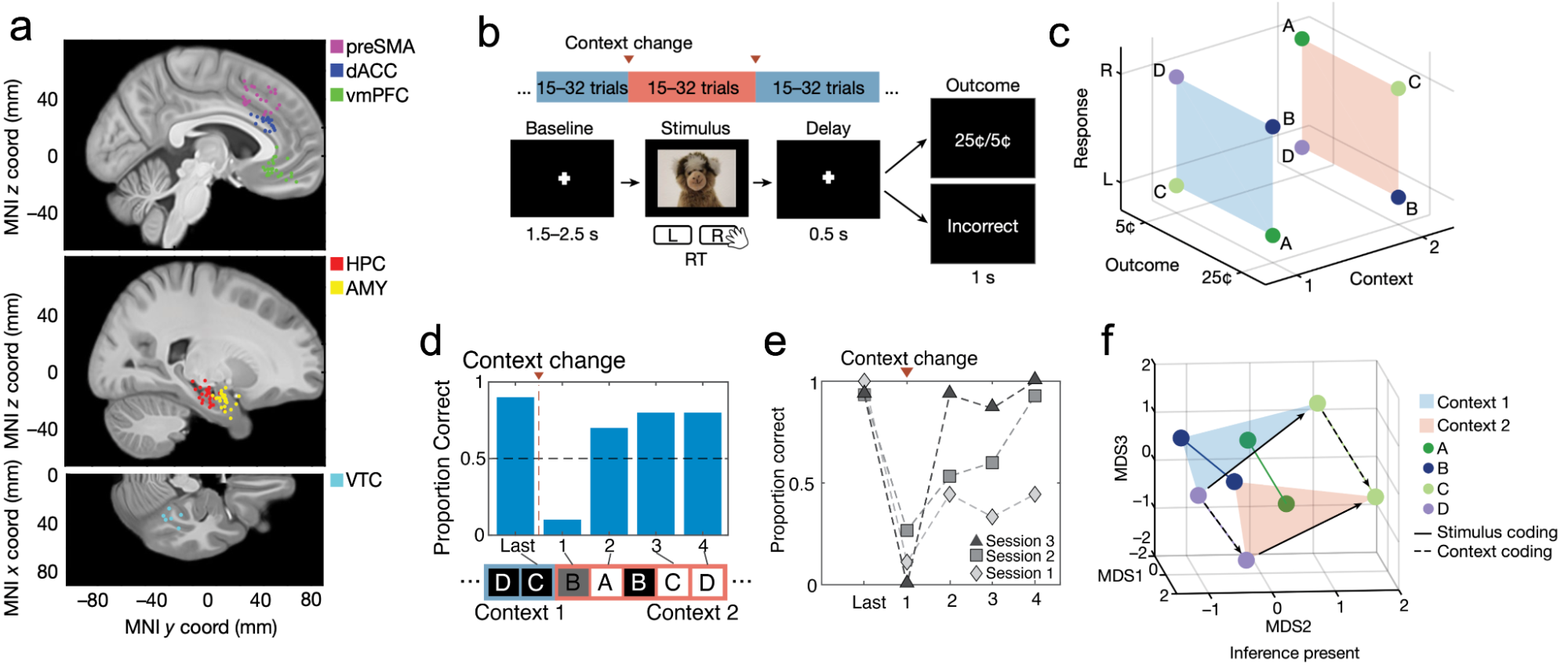 The previous work on abstraction in non-human primates took place after extensively training the animals to perform the task. It therefore could not make statements about the representational changes that accompany the emergence of abstract knowledge. Through a collaboration between Cedars-Sinai Medical Center (CSMC), Toronto Western Hospital (UWH) and Columbia’s Center for Theoretical Neuroscience (CTN), we were able to observe this emergence for the first time, in humans, with single-cell resolution. To this end, we recorded the activity of more than 3000 neurons, across 6 different brain areas in 17 patients as they performed an inferential-reasoning task. The patients were undergoing monitoring for epileptic seizures using implanted depth electrodes and volunteered to participate in our study during their hospital stay. Among the brain areas we monitored was the medial frontal cortex, the ventral temporal cortex, the amygdala, and the hippocampus, which is thought to be critical for the implementation of abstraction and inference-related computations. In the task, patients had to learn that each image shown on the screen was associated with a correct response (left or right) and reward (5¢ or 25¢). Both the correct response and reward associated with a stimulus were dependent on a context that was not directly observable. Each individual learned these context-dependent associations at their own pace, and through their performance on critical trials, we could measure their level of understanding over time.