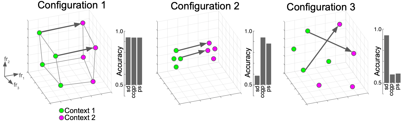 We relied on three metrics to quantify the content and format of the underlying representational structure: 1. shattering dimensionality (SD), 2. cross-condition generalization performance (CCGP), and 3. parallelism score (PS). Please see [1] for a more complete definition of these metrics, and what aspect of the representational geometry they capture. Figure 1 shows what these metrics look like for three different configurations of 8 task conditions in a toy 3D neural representation. In this example, one of the 35 possible dichotomies is color-coded and labeled as “context”.