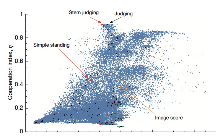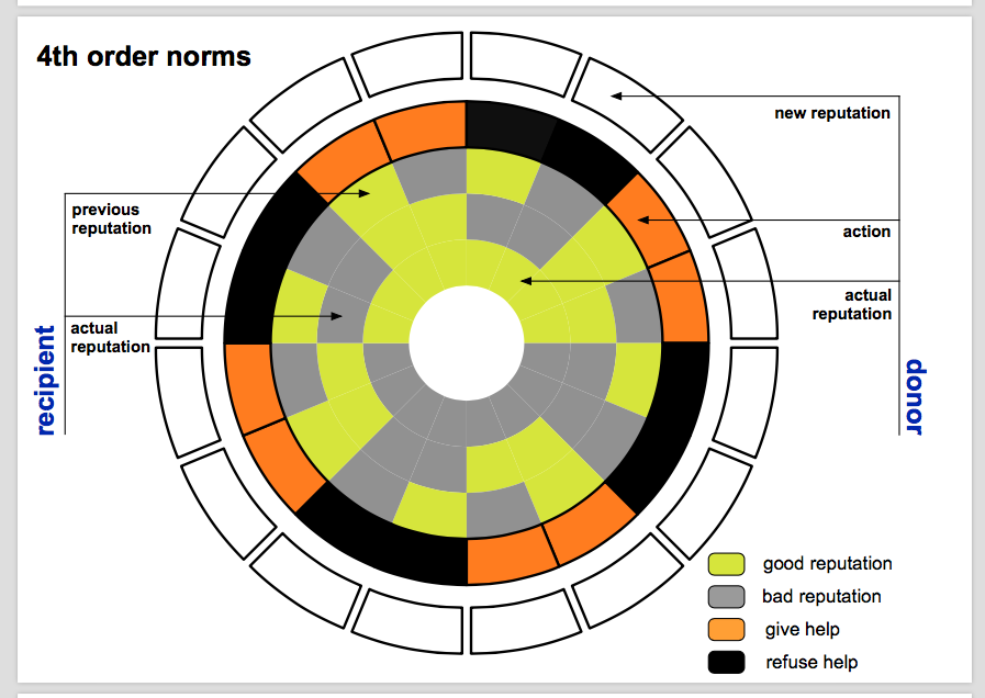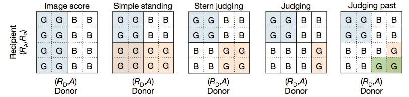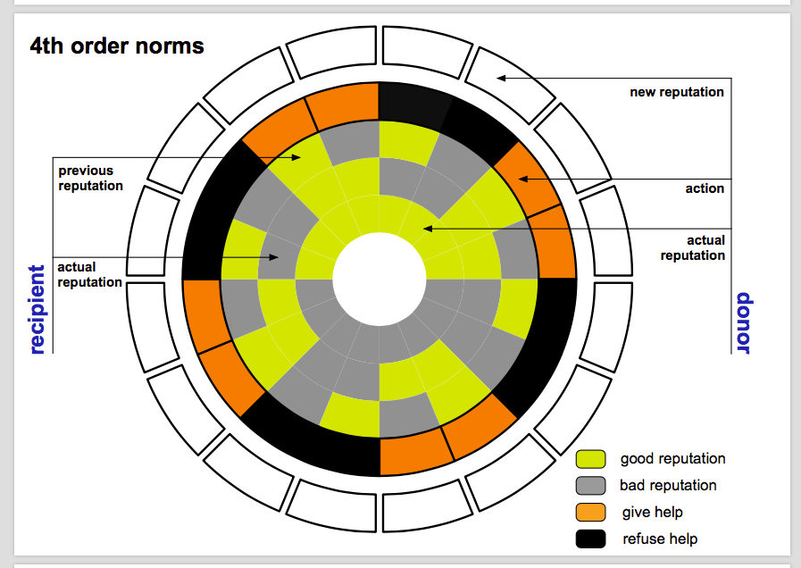 The story of our study, “Social norm complexity and past reputations in the evolution of cooperation”, now published in Nature, dates back from late 2013. Francisco and Jorge presented me the idea of relating past reputations with the evolution of cooperation in indirect reciprocity, as a suggestion to include in the PhD application I was preparing. I was reading about models of indirect reciprocity, social norms and cooperation and I couldn’t avoid a bittersweet feeling about the proposal: the plan seemed fascinating and original given the literature I was reviewing; the intended extension was conceptually simple to describe; yet, the colorful rings in the slides concealed tens of thousands of social norms begging for a long and tedious computational analysis.