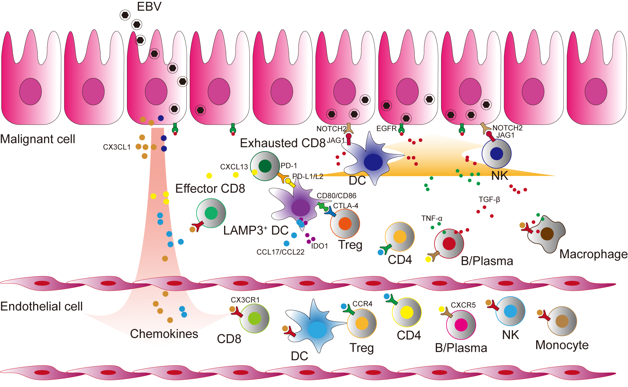 Nasopharyngeal carcinoma (NPC) is a distinct type of head and neck cancer, which features with the infection of Epstein-Barr virus (EBV) and a high incidence across Southern China and South-eastern Asia. In recent years, the overall survival rate of nasopharyngeal cancer patients has been improved with the advancement of radiotherapy and chemotherapy technology. Nevertheless, more than 10% of patients develop recurrent and metastatic NPC (Chen et al., 2019). A limited proportion of patients benefit from the targeted therapy with an inhibitor for epidermal growth factor receptor (Chan et al., 2005) or immunotherapies using the immune checkpoint blockade (Hsu et al., 2017; Ma et al., 2018). These variations in treatment responses and survival outcomes indicate the heterogeneous nature of NPC. Previous studies have revealed the molecular basis of the heterogeneity of tumour cells from the susceptible population genetics, tumour genomics, and EBV infection in NPC. However, the composition of diverse immune and stromal cell populations has not been well illustrated in tumour microenvironment (TME) of NPC. Therefore, it is essential that understanding the heterogeneity of cellular composition and dynamic changes of TME, which allows the discovery of mechanisms underlying treatment resistance and new therapeutic targets for patients with NPC.