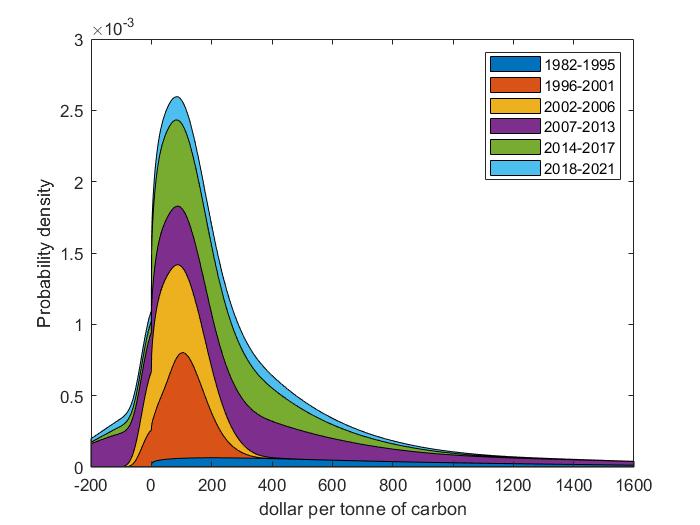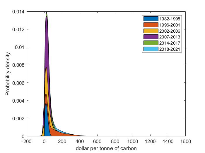 However, a new, bespoke statistical test does support the visual impression that estimates of the social cost of carbon have increased over time. The test uses kernel densities. A kernel density is a flexible probability density that does not force the data into any particular shape. In this case, the uncertainty about the social cost of carbon is large and asymmetric, with a thick right tail and a thin left tail. Furthermore, the weighted sum of kernel densities is a kernel density. This allows for a decomposition of any kernel density. Figure 2 decomposes the overall density by publication period for two commonly used utility discount rates. The finite sample version of Pearson’s test for the equality of proportions can then be used to test the null hypothesis that the component densities equal the overall density. This hypothesis is firmly rejected – also when controlling for the discount rate used. Estimates of the social cost of carbon have really increased – by more than a factor four in the last decade.