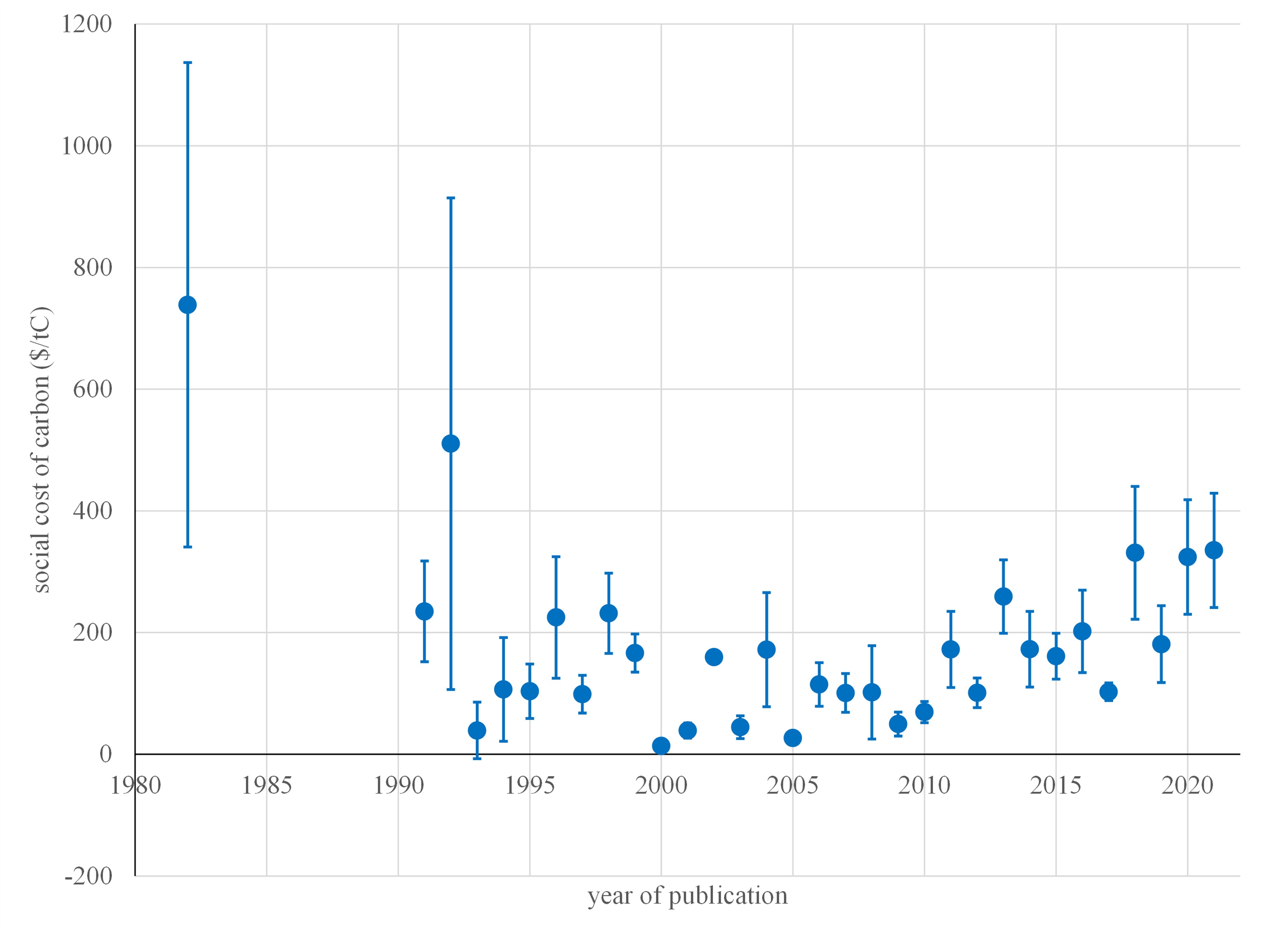 Figure 1. Estimates (average plus and minus the standard deviation) of the social cost of carbon by year of publication.