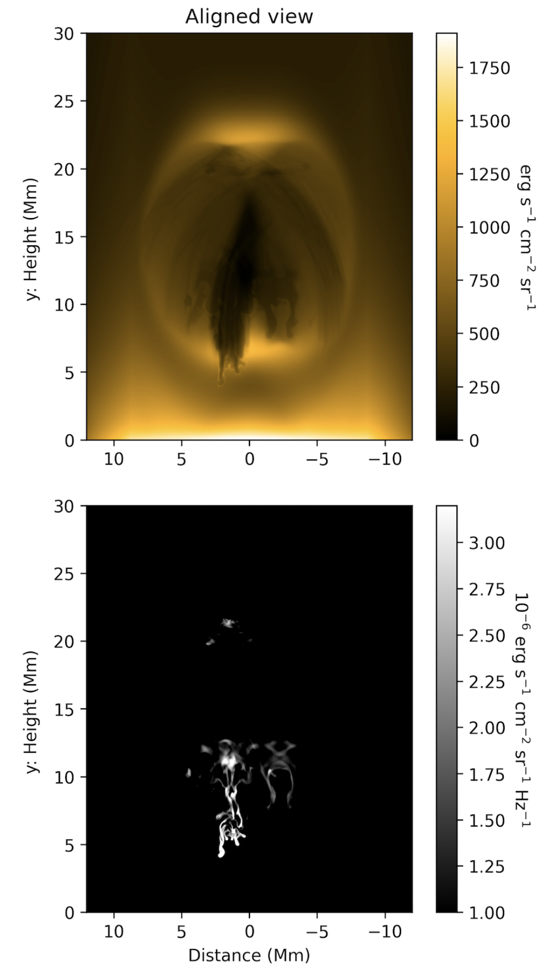The 'Aligned view' from the final snapshot of the above animation is reproduced here on the left. For this view, the LOS is set to run parallel to the orientation of the magnetic field that threads the lowest-most condensations which appear here with the characteristic vertically-aligned internal structure and dynamics - commonly termed 'falling fingers'. The reason for setting this criteria for viewing angle lies in the growth rate σ2 equation for the mRTi,
