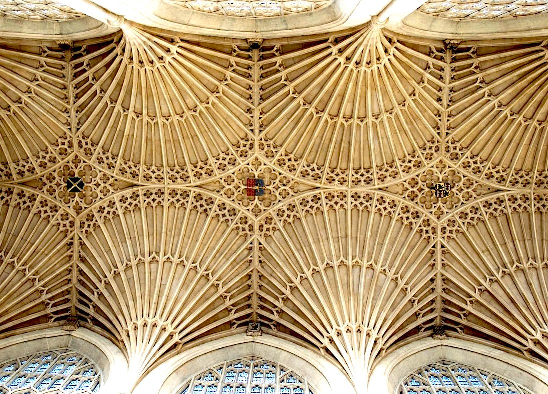 FIGURE 1: spandrels in architecture. Above, the ceiling of Bath Abbey in the U.K. Spandrels are the darker, profusely decorated structures in the middle of four rounded arches. Owing to their complex design, they can be interpreted perceived as functional key components of the system. Although this might be partially true, they are primarily a byproduct of other structural motifs. Photo by Ricard Solé.