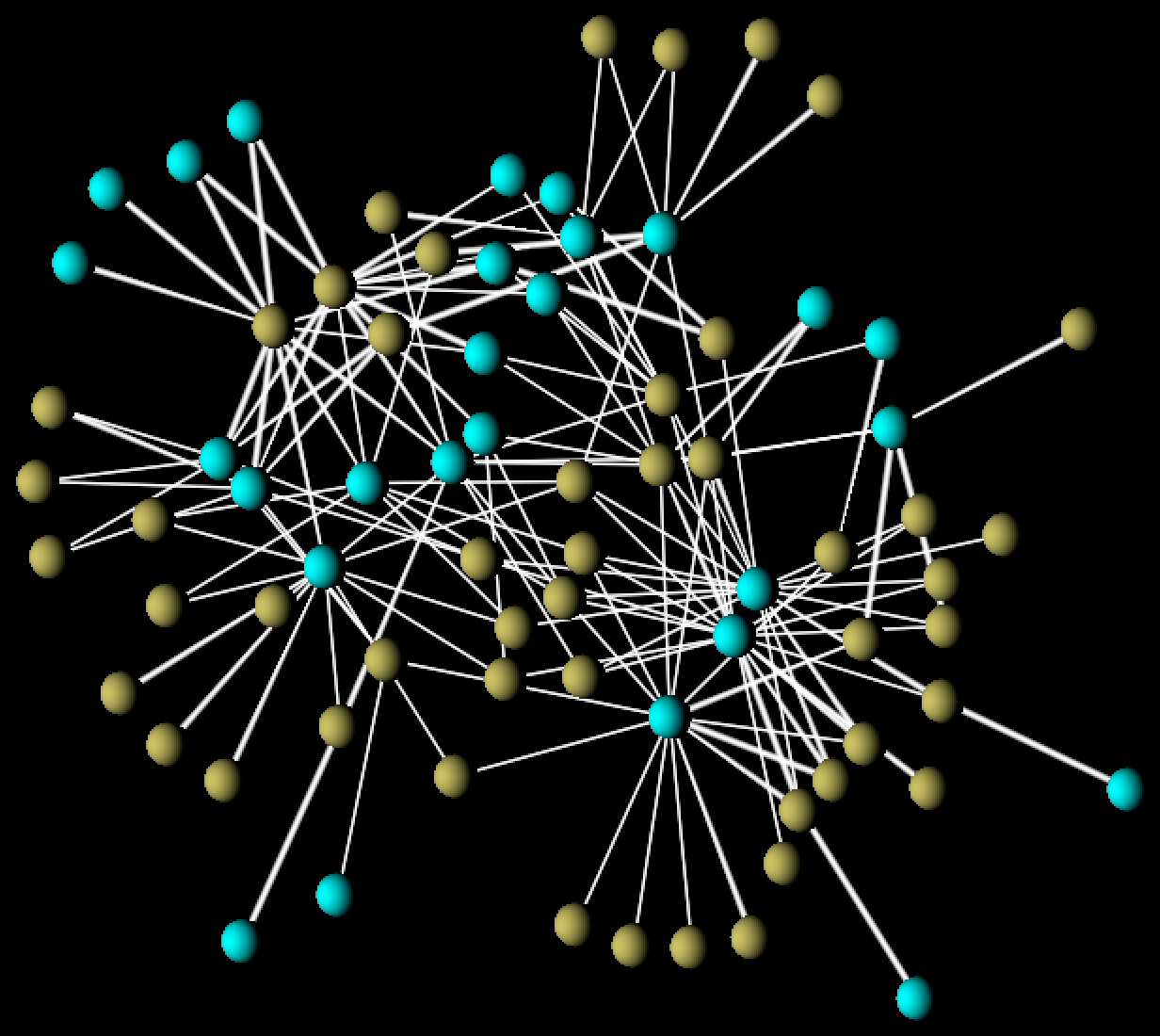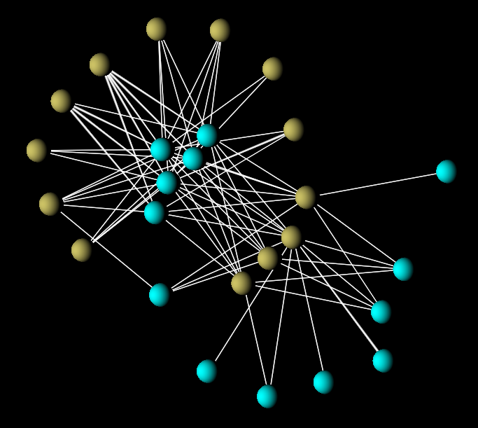 FIGURE 3: a synthetic (generated) network from our model of mutualistic webs. Here ochre and turquoise denote species of plants and pollinators. In the paper, we show how statistical properties of such networks are equivalent to those of real-world networks.
