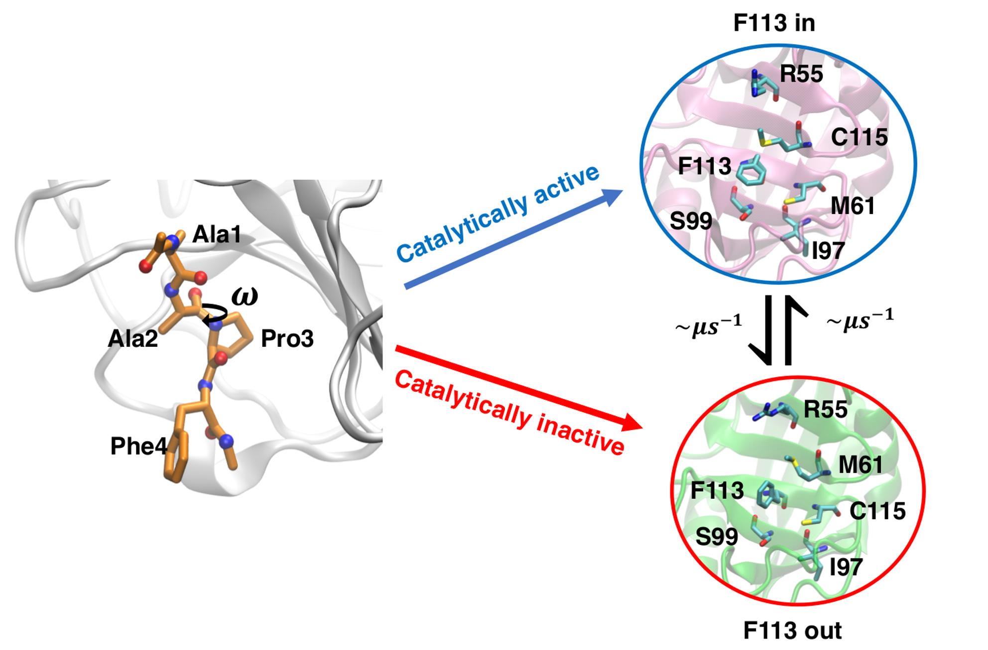 We found that our simulations could reproduce well the changes of the shape of the active site of cyclophilins observed previously by X-ray diffraction experiments. Our models could also reproduce well the differences in catalytic activity of different variants of cyclophilin A. However, what was surprising is that the differences in catalytic activity between cyclophilin A variants were due to a conformational change that occurs on a nano- to microsecond time scale. This is 5 to 6 orders of magnitude faster than the time scale on which motions critical for catalysis had been previously suggested. Our models therefore suggest that previous studies linking millisecond protein dynamics to function in cyclophilins may have overlooked important functional motions occurring on nano to microsecond timescales. This has important implications for catalysis research as different methodologies have to be developed to probe molecular motions on different timescales in enzymes.