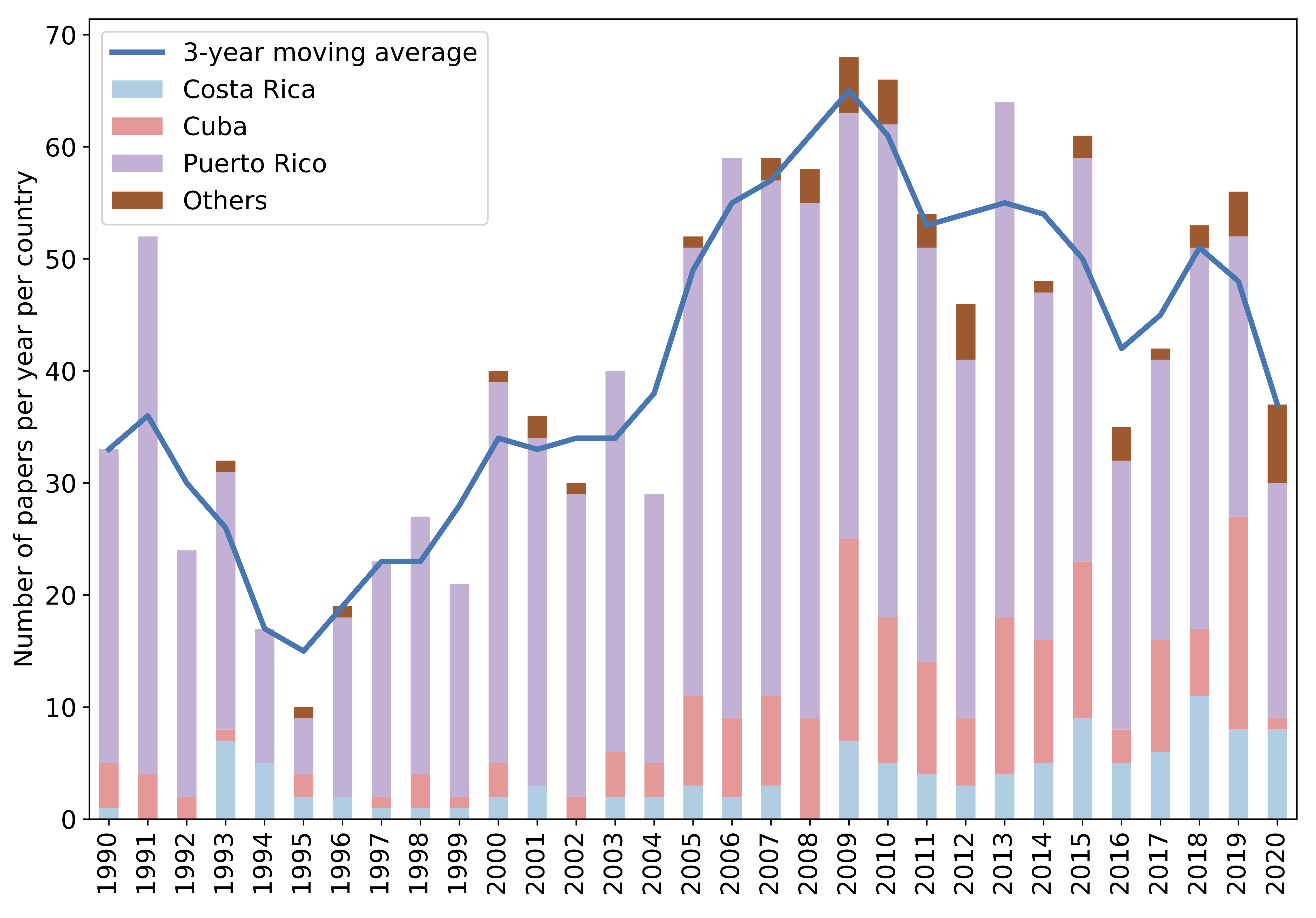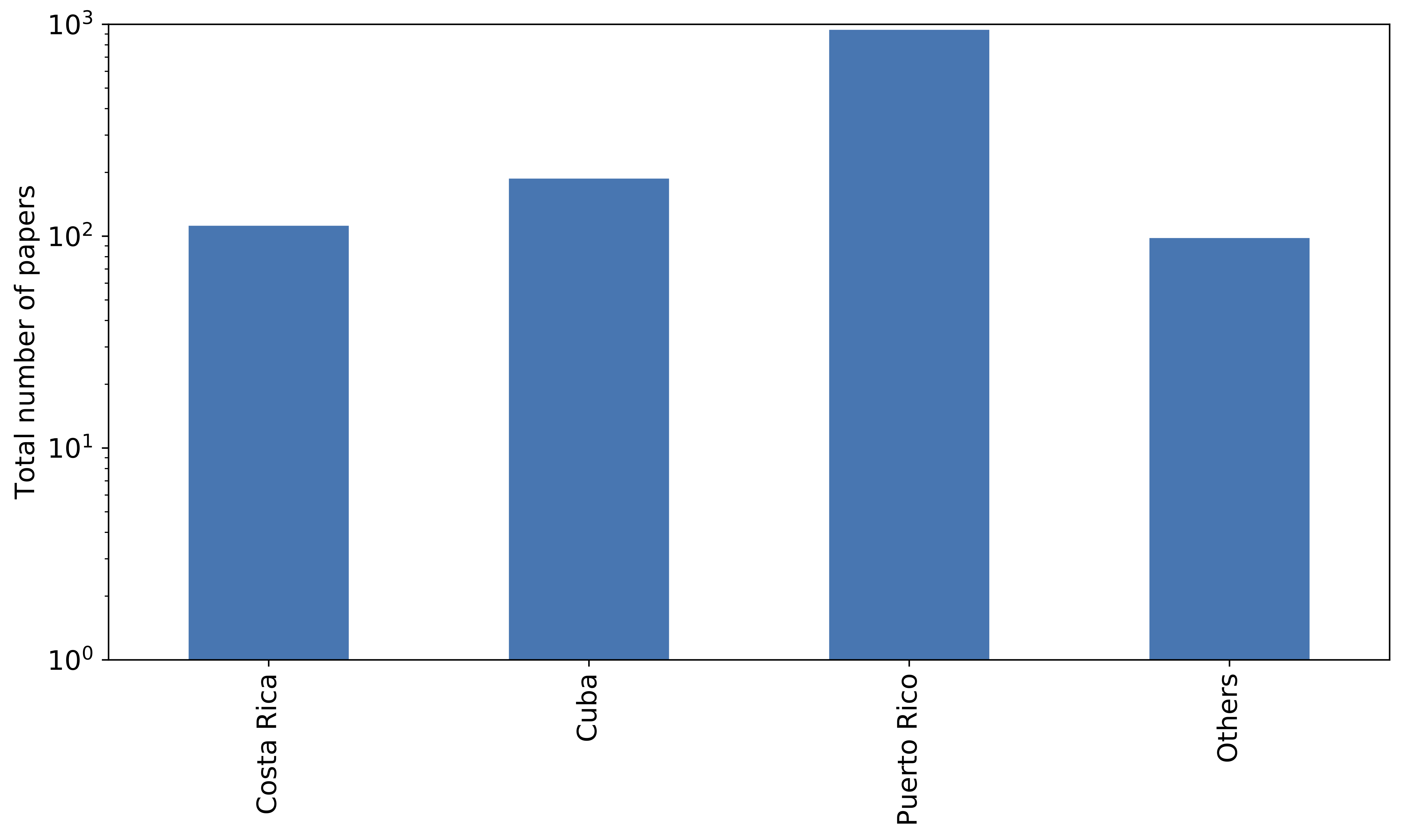 Before addressing the current status of Astronomy in the region, let us first introduce the most prolific territories in the region. As seen in Figure 1, infrastructure is the kingmaker. It is not surprising that the most prolific territory is Puerto Rico, given that it is home to the Arecibo Observatory, the only facility of this scale present in the region. The percentage of papers from Puerto Rico that are directly linked to the Arecibo Observatory is ~ 72%. This number, albeit representative of the impact of the observatory, is not the whole story. The presence of such infrastructure attracts guest astronomers, and it affects other intangible factors like the motivation to study astronomy through outreach activities. In fact, over 100,000 visitors come yearly to Arecibo and about 30% of them are school children.