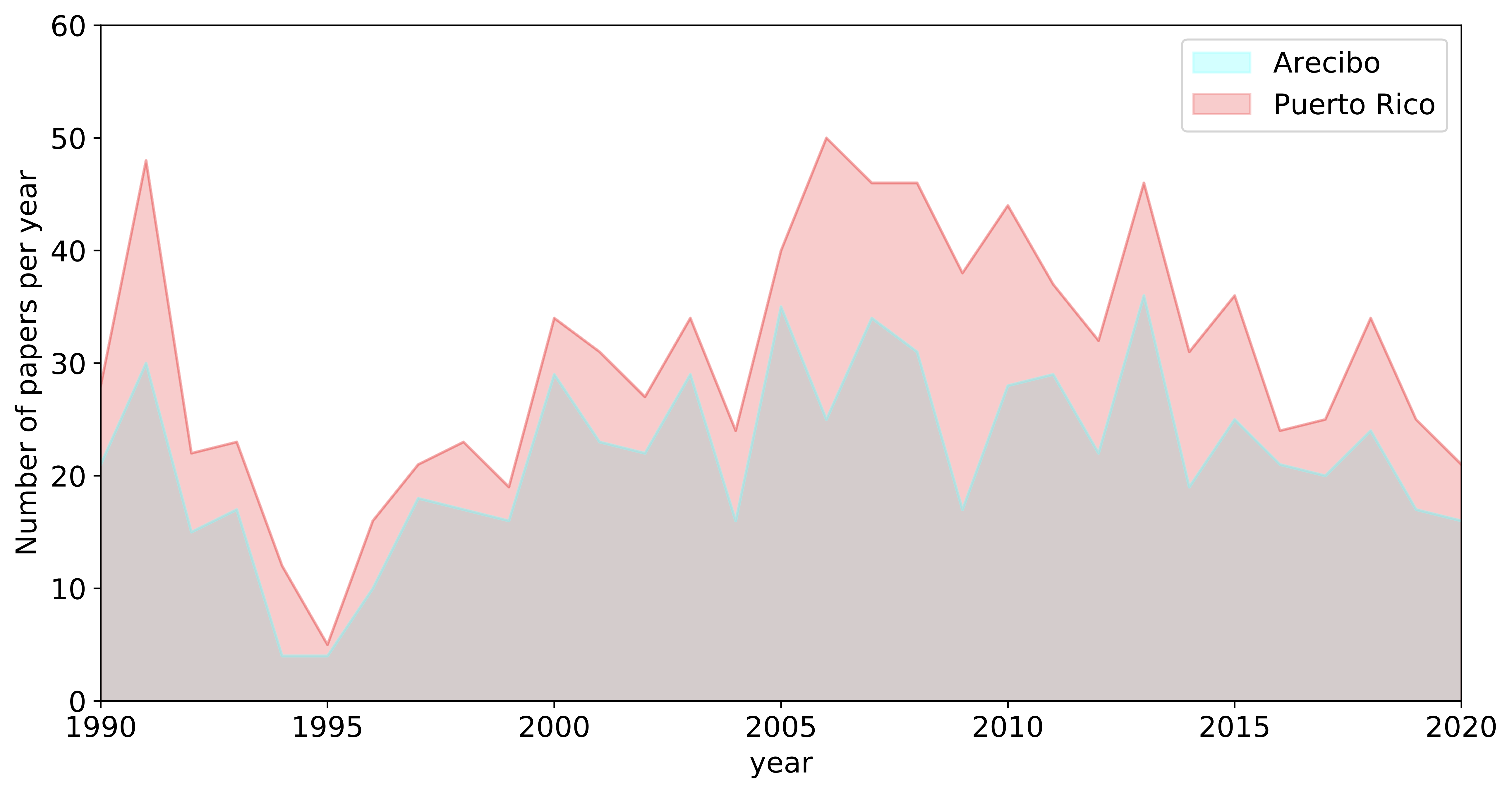 Infrastructure seems to be the most important factor to drive Astronomy in the region since it provides data, attracts astronomers, trains the next generation, and motivates the future ones. Alas, the Arecibo Observatory suffered major damage and its future is uncertain (there are compelling reasons to rebuild a telescope in Arecibo). In Figure 4, we have highlighted the role of the Arecibo Observatory as the primary engine pushing Astronomy forward in the region.