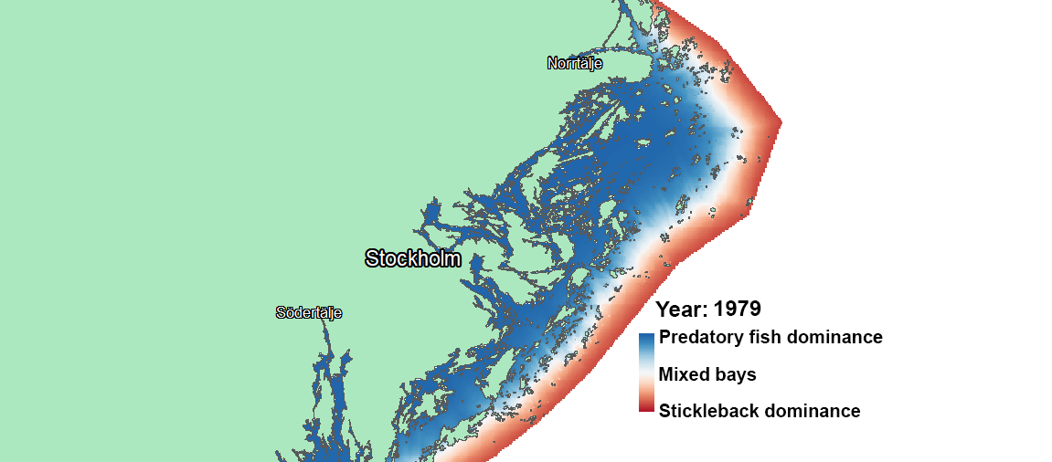 Adding km water distance from offshore areas as a predictor in our models made all the difference; we now had clear evidence of a spatial regime shift. The animation below shows the statistically predicted dominance of perch and pike versus stickleback for the Stockholm archipelago over nearly 40 years, where blue and red are areas with perch- and pike- vs. stickleback-dominance, respectively (Fig. 4). The shift clearly started in the outer archipelago close to the open sea (right-hand side) and gradually spread towards the mainland (left) like a ‘stickleback wave’.