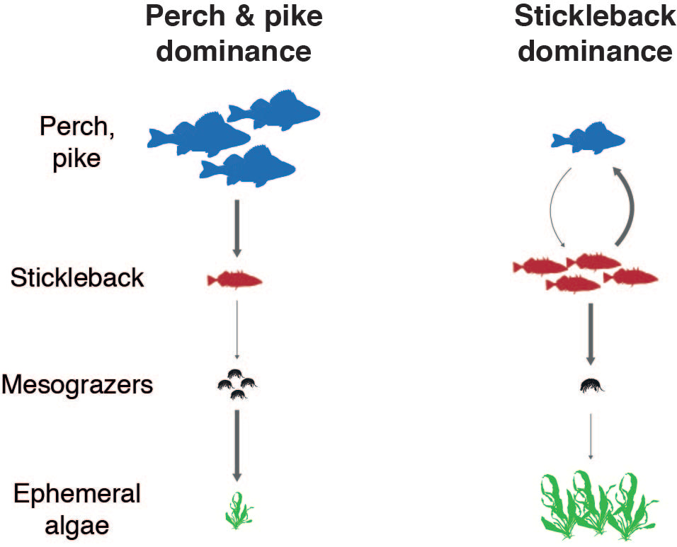 Fig. 5. Key trophic interactions in perch- and pike vs. stickleback-dominated shallow coastal bays.