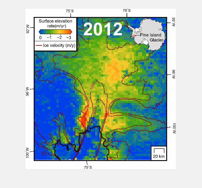 PIG is a truly huge glacier. Its catchment is bigger than the area of England and it has its vvery own Wikipedia page (https://en.wikipedia.org/wiki/Pine_Island_Glacier). With so much interest in PIG and so much research published on it, we were not expecting to see any surprises when we started looking at a new, high resolution data set of elevation change over PIG that we had produced from satellite radar altimeter data. Radar altimeters measure surface elevation with relatively high accuracy but, until recently, relatively poor spatial resolution. In 2010, a new type of radar altimeter was launched, called CryoSat-2, and it allowed us to map the changing elevation of the ice surface with a resolution of up to 500 m. When we did that, we were surprised by what we found. Previous studies with radar altimetry had shown that the biggest elevation changes were taking place over the areas of fastest flowing ice. This is what glaciological theory suggests we should expect. What we found, however, was a very different picture. The largest elevation change was occurring in the slow-flowing margins of the glacier and thinning in the fast-flowing main trunk had decreased by about a factor five since it’s peak slightly over a decade ago. The animation below shows how the thinning is changing over the period of our observations: