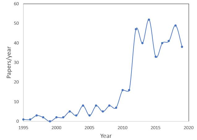 Antarctica is the sluggish, sleeping giant of the climate system, isn’t it? Well that was what many glaciologists thought until about twenty years ago when new satellite observing systems revealed a far more dynamic ice sheet than the models, at that time suggested, at least for West Antarctica. Over the last fifteen years dozens of studies, from both field-based and satellite observations, have shed light on how the ice sheet has been responding to variability in the rest of the climate system. The Amundsen Sea Embayment in West Antarctica is a hot spot for rapid changes in ice flow and, as a consequence, also for the research community working on ice sheets. It’s a region that is believed to be particularly at risk and potentially unstable. A major new programme between the UK’s Natural Environment Research Council and the US National Science Foundation is currently underway to study one the largest and most vulnerable ice streams in this sector called Thwaites Glacier (https://thwaitesglacier.org/). It’s immediate neighbour, Pine Island Glacier or PIG, has been the single largest contributor to sea level rise from Antarctica over the last decade. It has received a lot of attention from the glaciological community as a result. The graph below shows the number of papers published/year that discuss PIG and it’s clear that research on the glacier really started to accelerate at the beginning of the last decade. The total number of papers shown in the graph is 430.