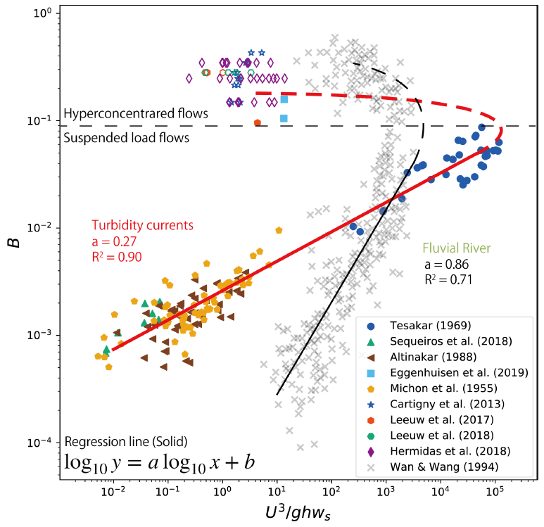 Once Sojiro’s dataset was nearing completion, Rob asked Sojiro to test out a few of the results from conventional models of gravity currents based on wisdom from open channel flows, in particular the balances in the self-acceleration model. One of the figures they plotted in included here as Figure 1. What this figure reveals is very surprising. The trend is highly nonlinear (not the log scales of the axes), showing that the established models for gravity currents do not capture the internal energetics. Instead, the dynamics of real gravity currents are non-linearly related to the quantities in the self-acceleration model. How can we understand this result?
