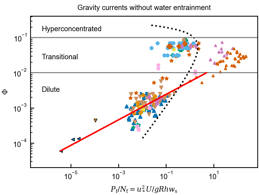 Figure 1: An early version of the plot comparing available flow energy (x-axis) with the energy required to keep sediment in suspension (y-axis) according to models based on fluvial systems. Data for a river is included in grey with a black best fit line, while data for gravity currents is in colour with a red best fit line. It is clear from this figure that the two systems are very different.