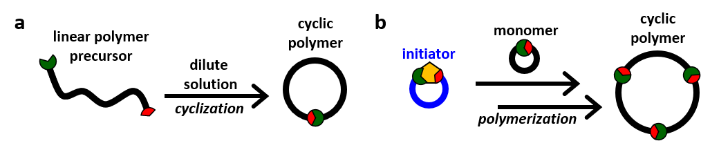 Fig. 1 | Synthesis of cyclic polymers using a, a unimolecular ring closure and b, a ring expansion polymerization.
